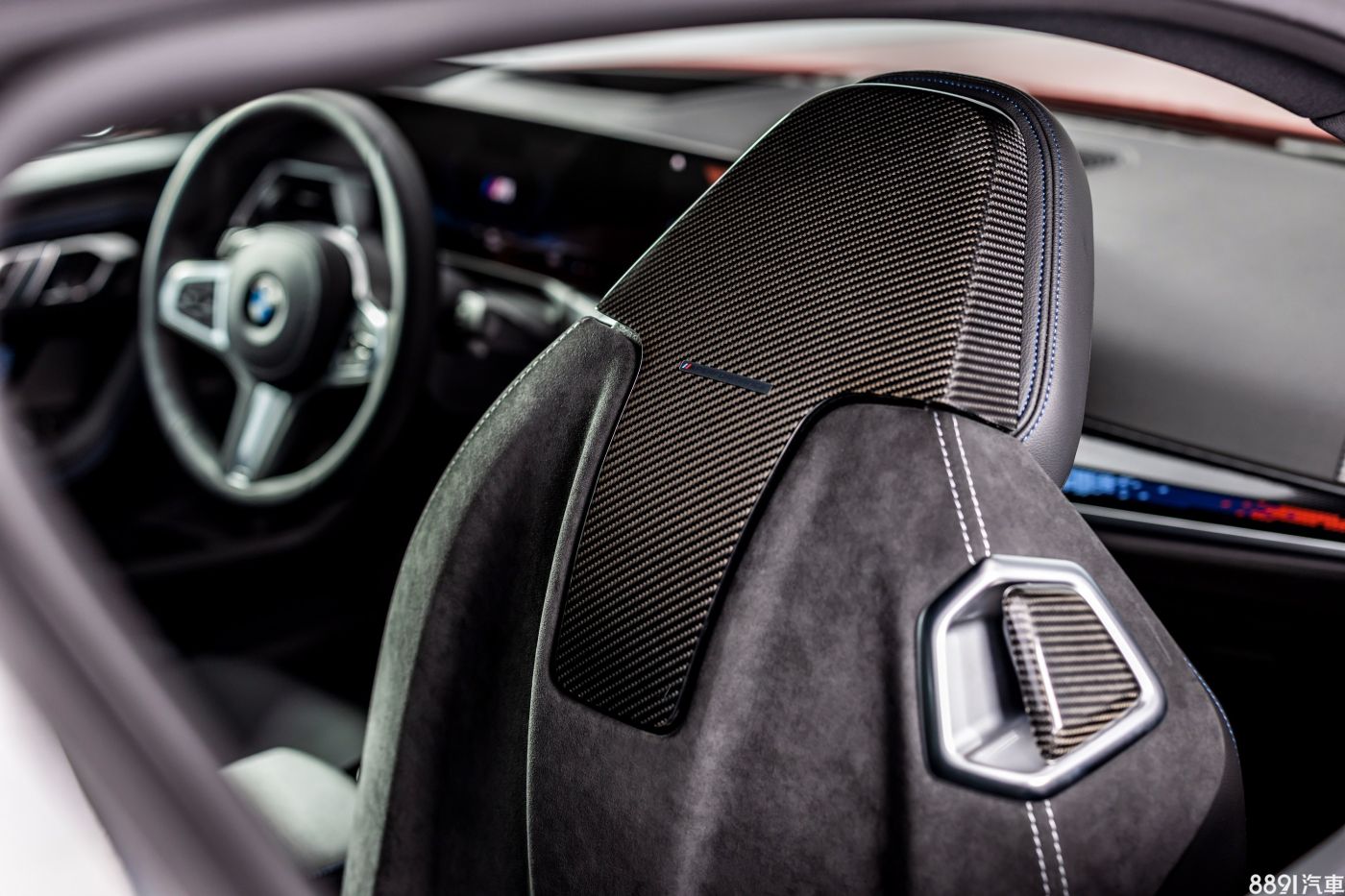 內裝部分,同樣散發著性能味!開啟車門就能看到M Performance字樣的碳纖維迎賓踏板,而前排兩張跑車座椅椅背,以碳Alcantara麂皮+碳纖維材質妝點,營造出濃厚的競技氛圍。
