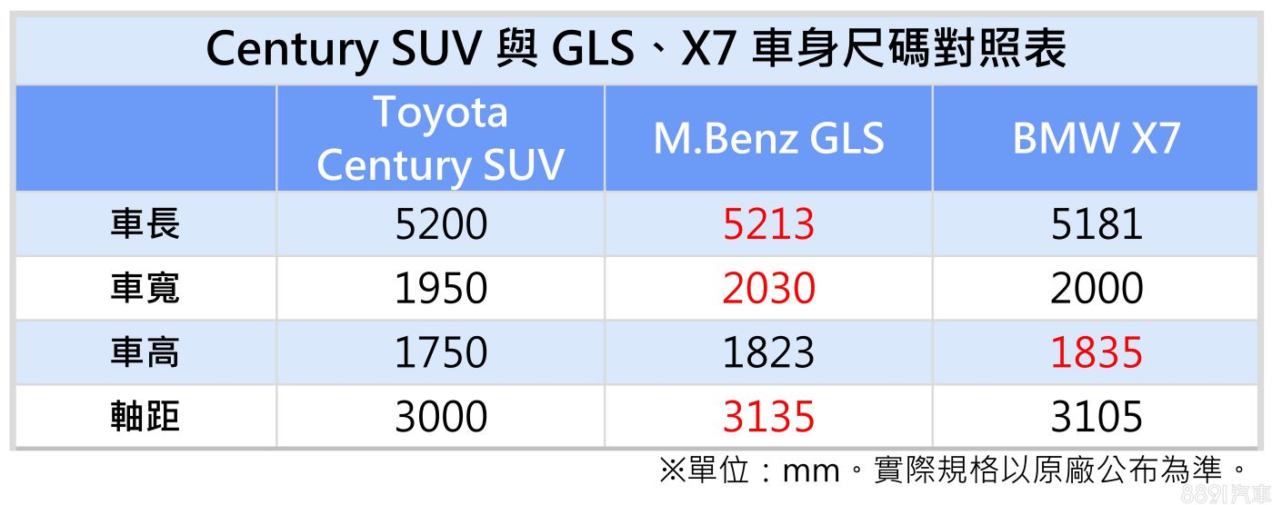 雖說距離發表時程還早,不過日本媒體搶先曝光了部分新車資訊。當地報導列出了Century SUV主要車身尺碼數據,宣稱具備3米整的軸距設定,車長則有望來到5米2之譜,整體大小與M.Benz GLS和BMW X7等大型豪華三排SUV相當。