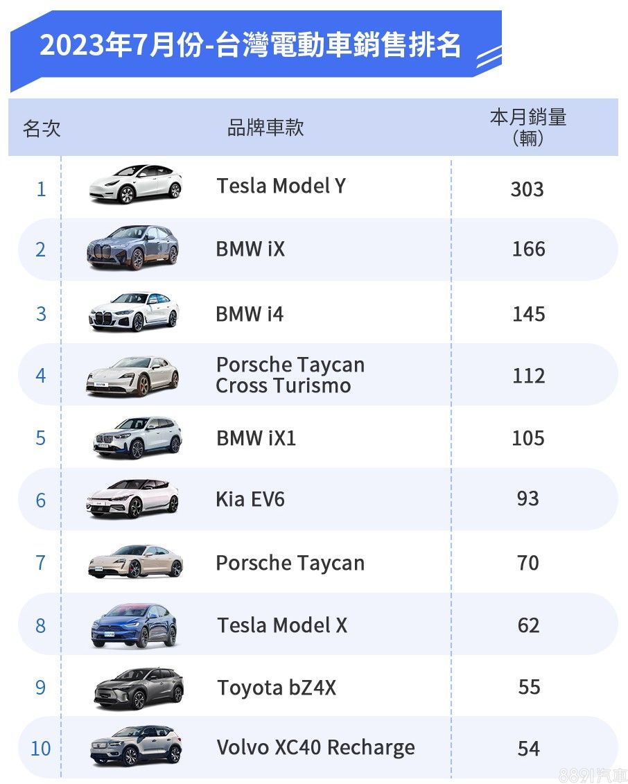 Tesla雖維持品牌強勢,不過銷售表現明顯衰退,即便Model Y仍以303輛掛牌數拿下市場龍頭,但相較於6月成績其實有著73.9%的跌幅,同品牌的Model X則以62輛的表現,從第二名落到第八的位置。