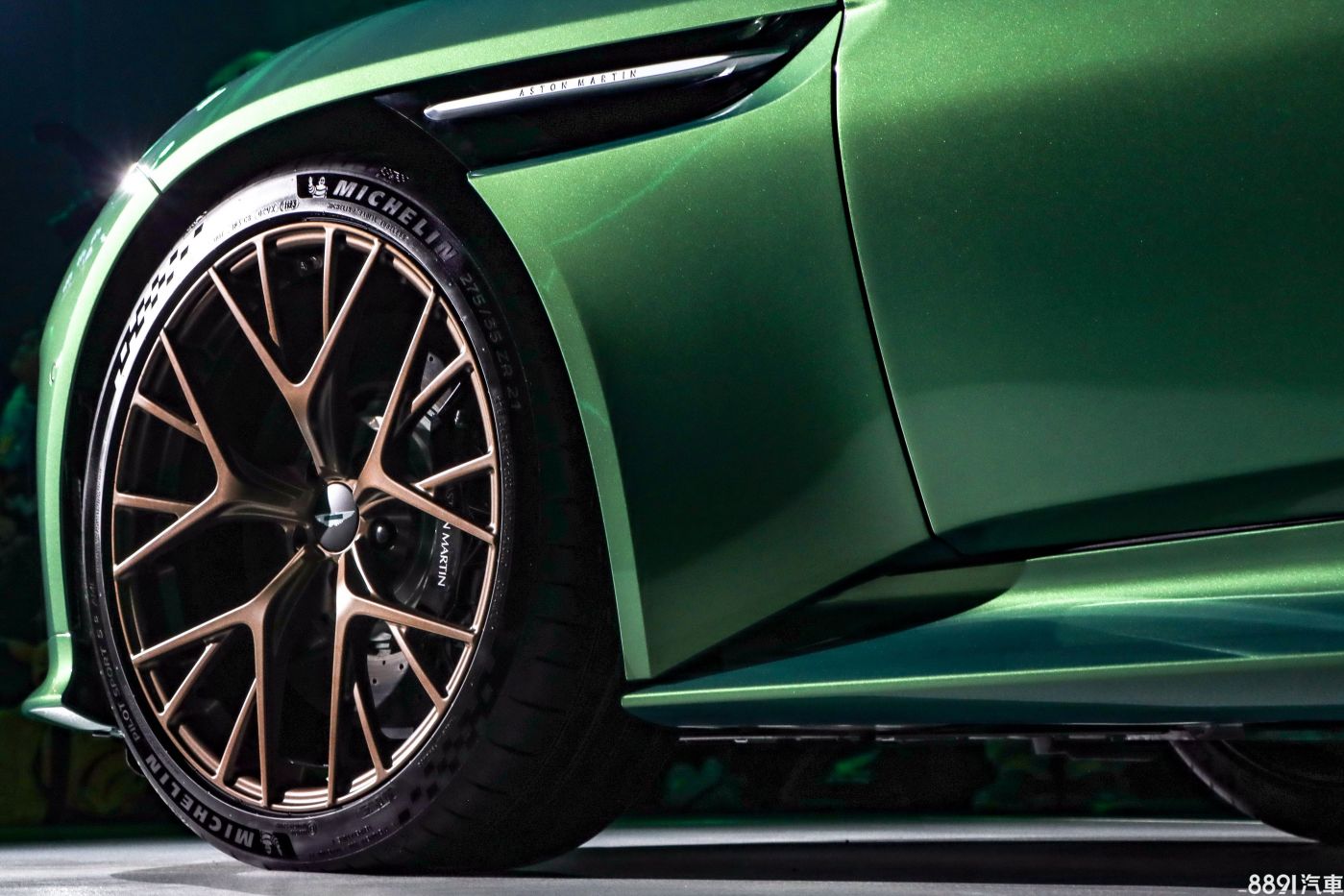 標配21吋鍛造鋁圈,原廠稱比DB11的20吋款還輕了8kg,配胎則是前275/35R21、後315/30R21的米其林Pilot Sport 5 S跑胎,胎壁的「AML」字樣,代表著是Aston Martin「專屬訂製」款,此外,配置前400mm、後360mm的通風打孔碟盤,並提供陶瓷碳纖維煞車可選。