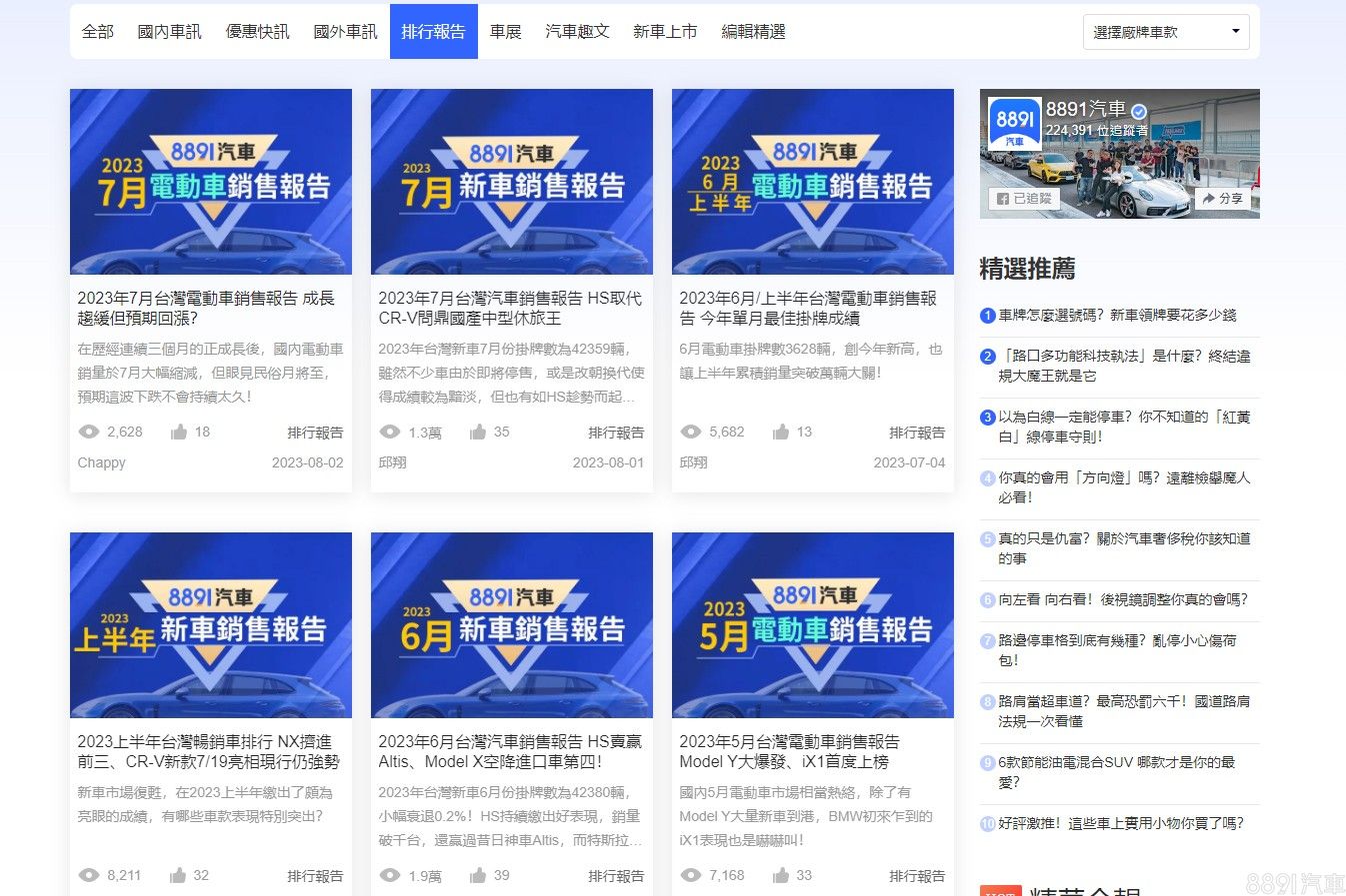 每個月第一個工作日,8891汽車都會彙整與分析前一月份的國內新車掛牌數,製作成「台灣新車銷售報告」並於當日刊登,除了整理國內各品牌成績、新車銷售輛排行榜和漲跌表現外,也會列舉當期新掛牌的特色稀有車。