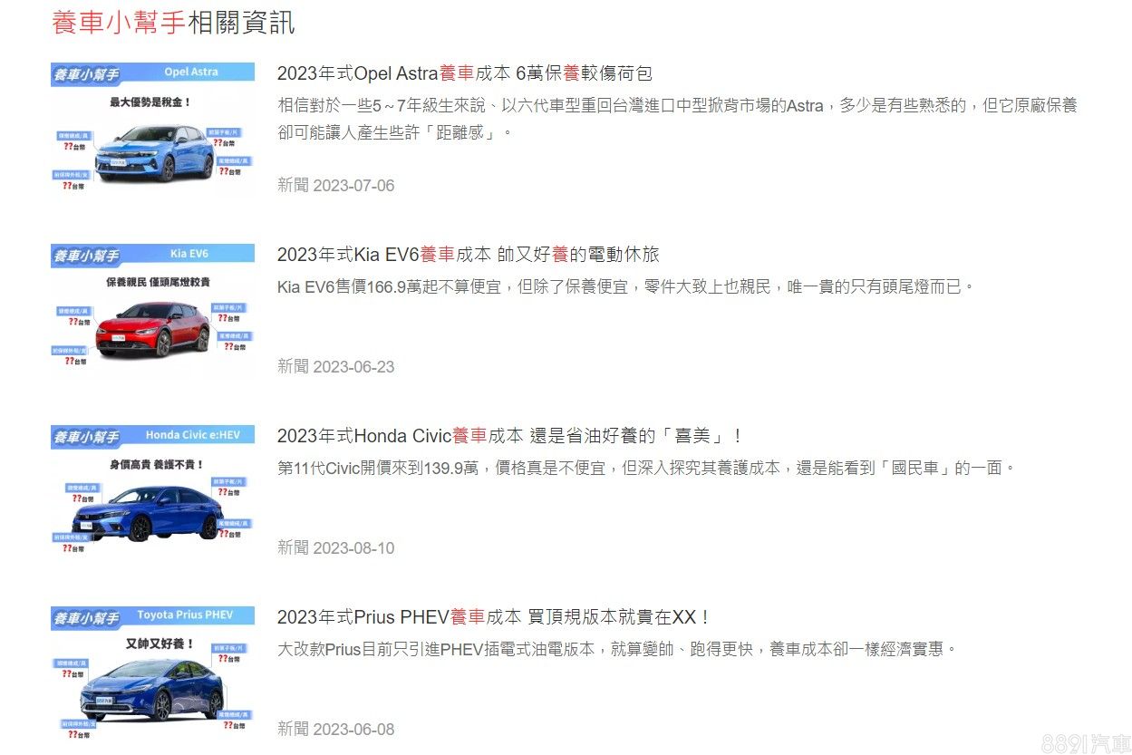 車價和規格固然是購車關鍵,不過後續養車經濟性也受到不少消費者關注,這時候看8891汽車的「養車小幫手」就對了!羅列車款原廠定保費用、零件價格和稅金與油錢估算等資訊,讓各位消費者在買車前做功課時,除了車友之外還有更詳盡的參考資源。
