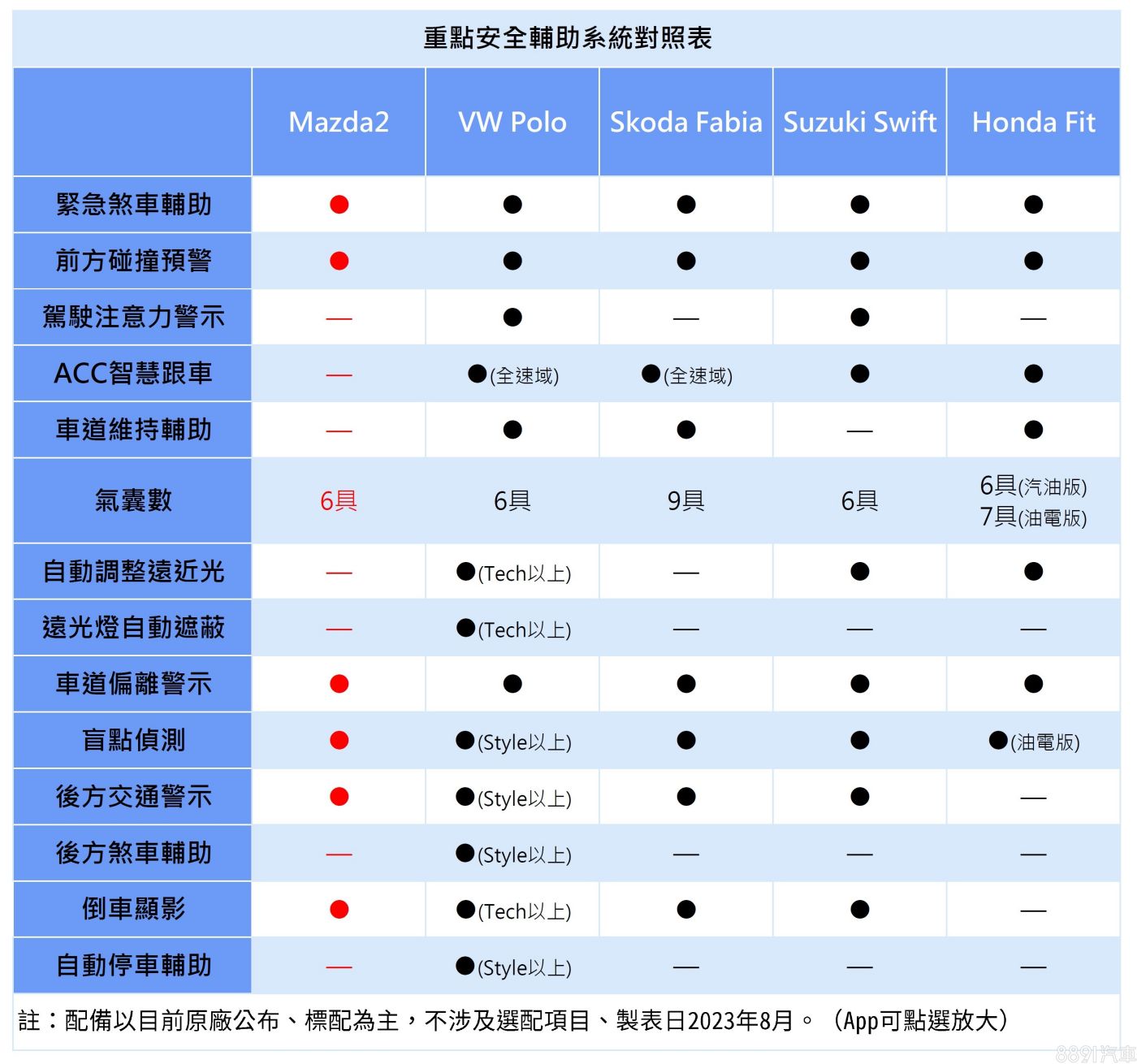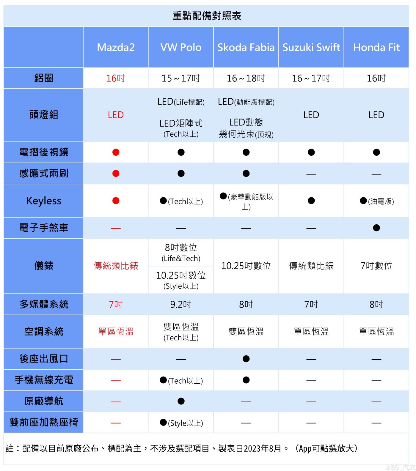 配備表一攤開,就能感受到「一分錢一分貨」的道理,Mazda2、Swift價格相對親民、配備上略為陽春可以理解,而價格上看「8字頭」的Fabia與Polo配備明顯豐富許多,不僅標配大尺寸的數位儀錶與車載螢幕,在中、高階車型以上,還提供對手所沒有的進階LED頭燈。