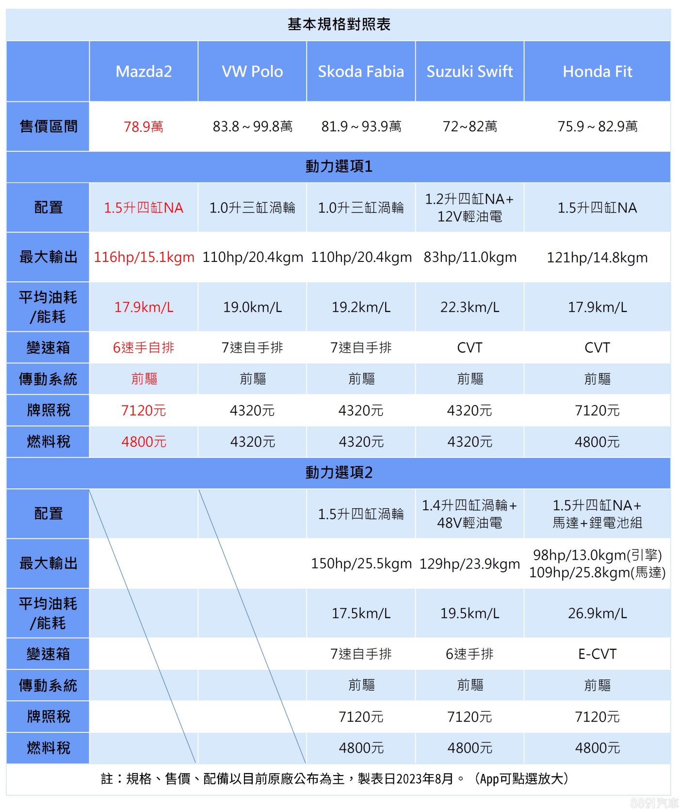 二度小改的Mazda2,採單一車型設定,雖然售價已較先前降了1萬,但作為一輛入門代步車,78.9萬絕對稱不上便宜!不過賣得貴,也要有相應的配備來吸引買家,這次我們找來進口同級對手VW Polo、Skoda Fabia、Suzuki Swift,還有「高貴國產小車」代表的Honda Fit,先來一場紙上評比,看一看差不多的預算下,誰的規格配備更有料!?