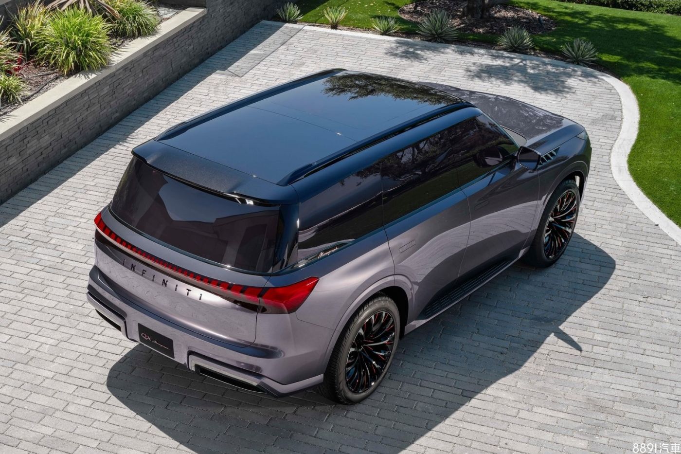 車側更可以感受這車的碩大,雖然官方未公布概念車尺碼,不過參考現行QX80的設定,車長應該至少有5米3,外觀則透過懸浮式車頂、隱藏式車門把手、大尺寸多輻式鋁圈等作為特色,讓這輛大型休旅看起來沒那麼笨重。