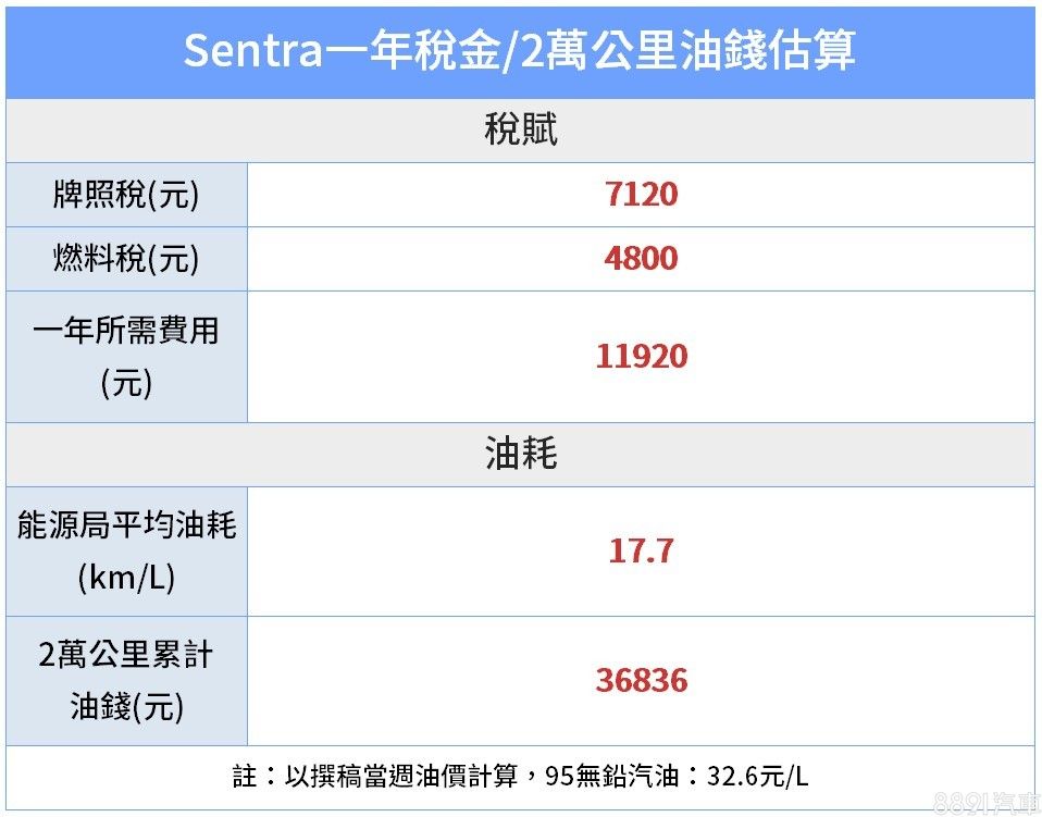 Sentra排氣量為1598c.c.,稅金級距落在1201~1800級距,每年所需花費牌照稅+燃料稅為11920元,和直接對手Altis相同,重點在於經濟性表現,能源局提供平均油耗數據為17.7km/L,算是相當不錯的成績,以撰稿當下95無鉛汽油32.6元/L來計算,跑2萬公里油錢為36836元。