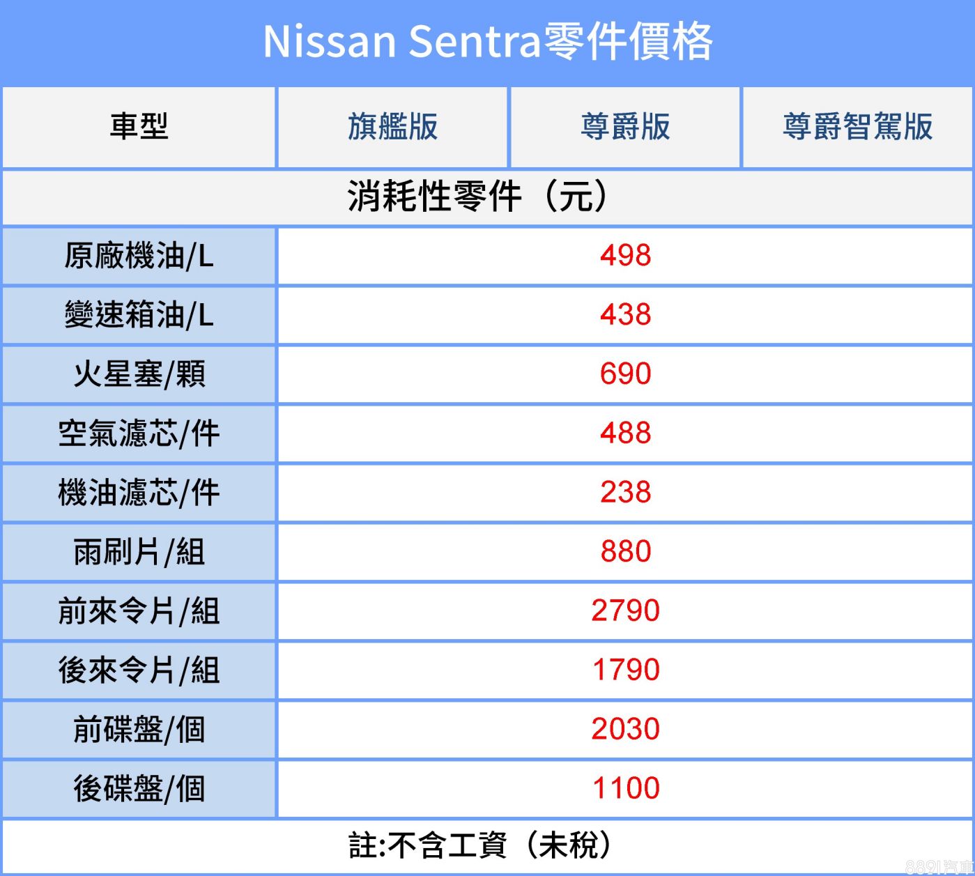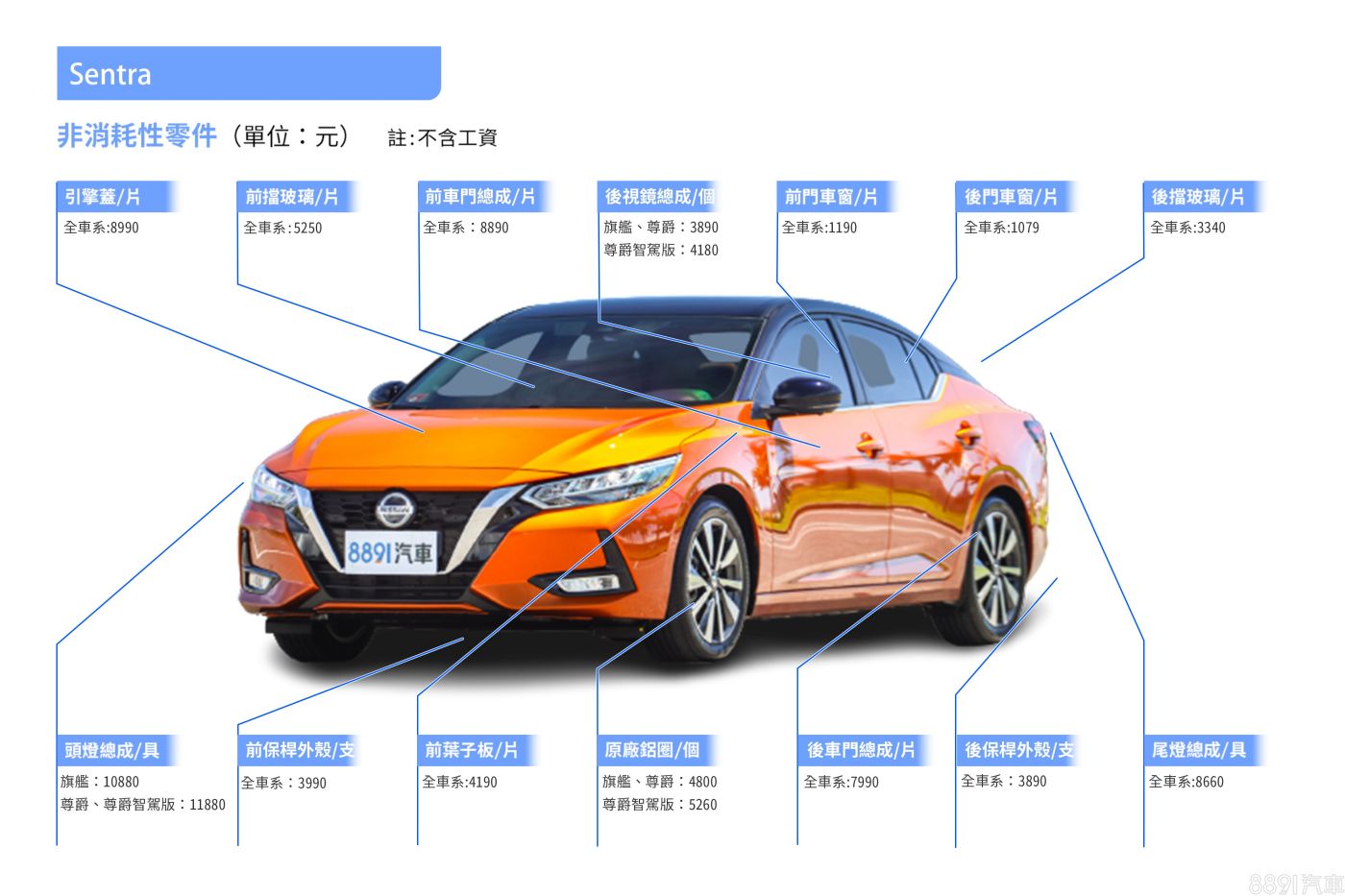 Sentra主要耗材費用一樣便宜,就算是費用相對高昂的煞車皮、碟盤,1~2千元就能解決。這裡所列舉的非消耗零件為外觀件,最容易碰撞的前後保桿換起來都不到4千,相對貴的是燈具,頭燈依版本不同,旗艦為10880、旗艦以上為11880,尾燈全車系都是8600元。