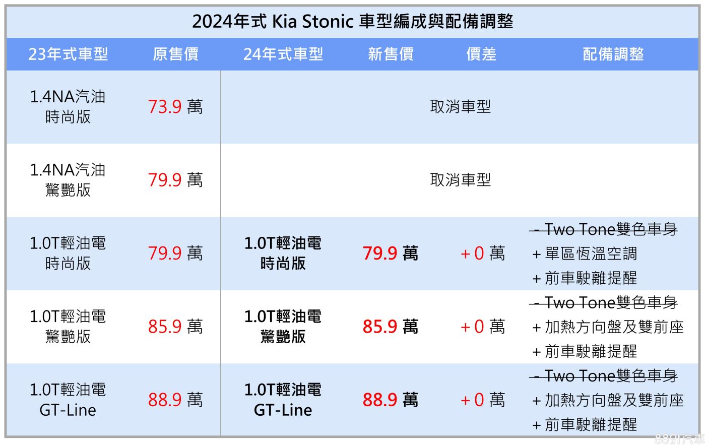 投入國內小型跨界市場的Kia Stonic,原本提供2款「1.4升汽油款」和3款「1.0升輕油電」可選,不過稍早推出2024年式車型後,也同步裁減陣容,僅供應輕油電車型,延續該動力的三種車型等級,但各車型配備規格均略有調整。