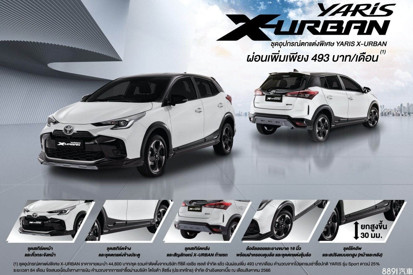 Yaris X-Urban在當地以升級套裝型式販售,開放泰規Yaris各級車型加價選搭。套件針對外型帶來跨界扮相,包含專屬保桿及側裙飾件、16吋雙色鋁圈和黑色車型銘牌外,懸吊也加高30mm,讓離地高從135mm增加為165mm,也提升Off-Road的視覺效果。