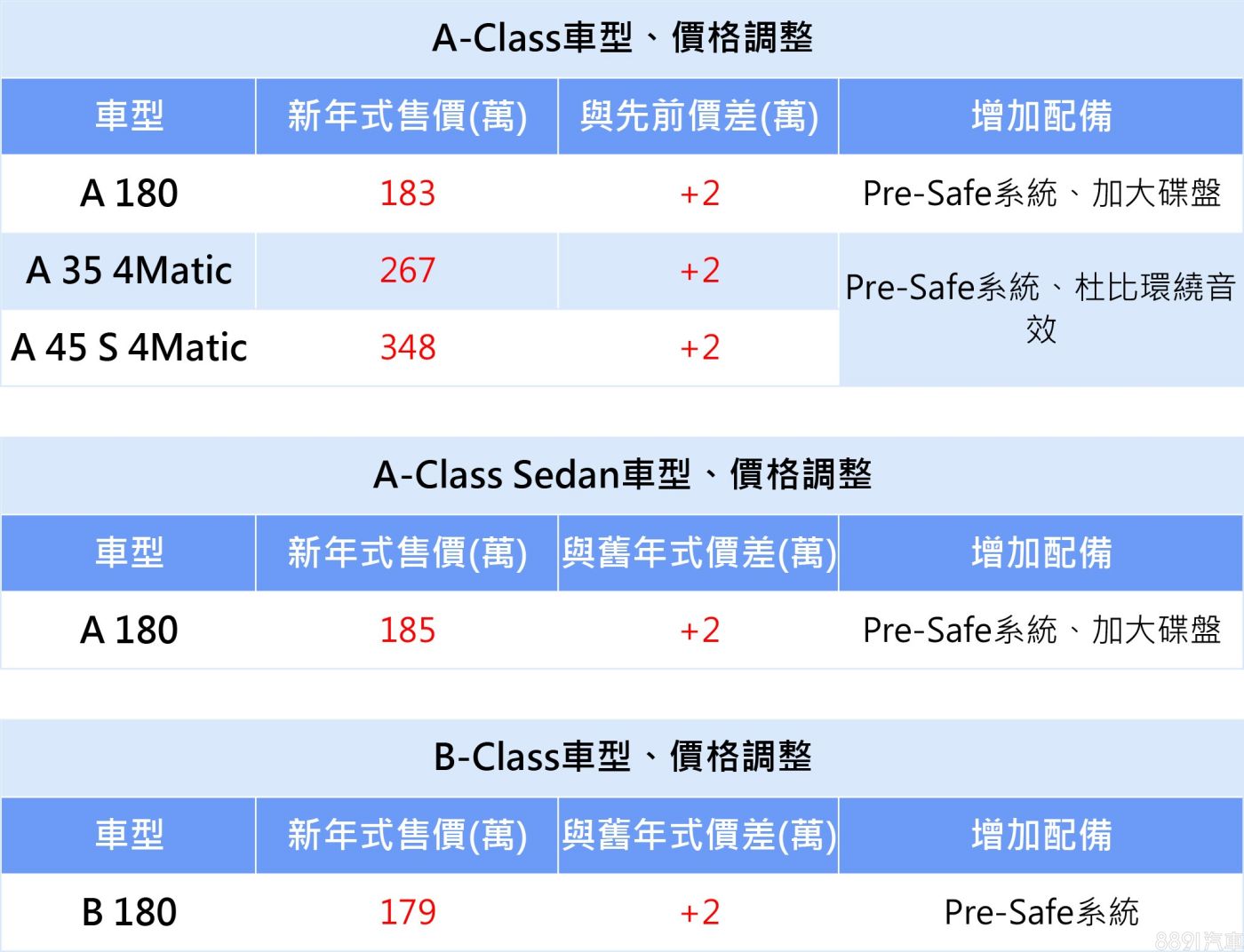 國內4月才剛推出小改款的A-Class掀背、A-Class Sedan和B-Class,三車系各車型均預計自新年式起調漲2萬,但也同步標配Pre-Safe主動安全防護系統,該系統原本因晶片缺料影響,當初小改款上市時並未搭載,如今將隨新年式補上。