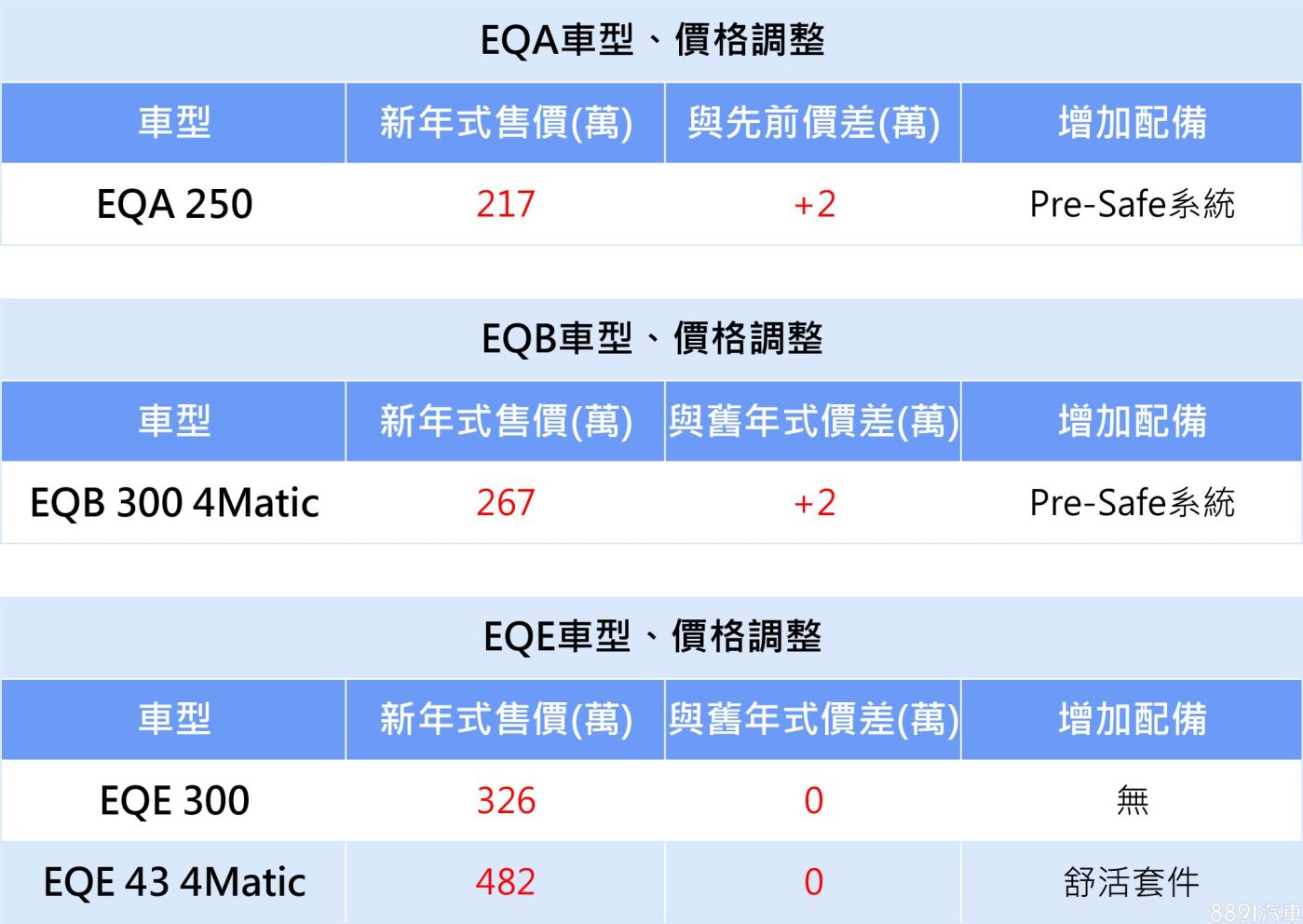 部份三芒純電也將跟進年式更新。小型電動休旅EQA和EQB也同樣於新年式小漲2萬,並新增標配Pre-Safe系統。而新年式EQE純電房車則未漲價,不過性能頂規EQE 43預期增配Energizing舒活套件。