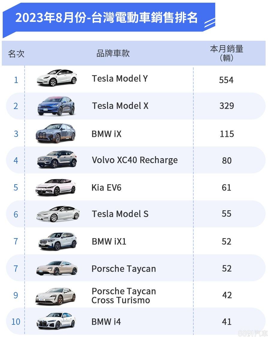 BMW則未見前月的強勢表現,旗下各款電動車系銷售量均在8月下修,不過仍穩住純電市場亞軍品牌的頭銜。另一方面,Volvo XC40 Recharge由於新年式在8月上市交車,成為榜中少數銷量成長的車系,更一舉拿下第四名的位置。