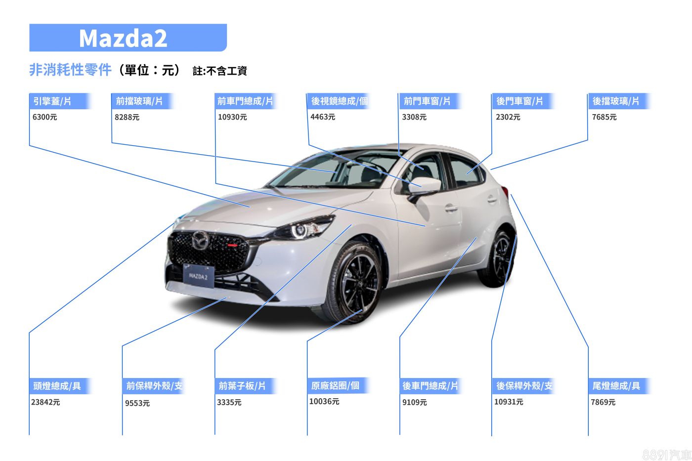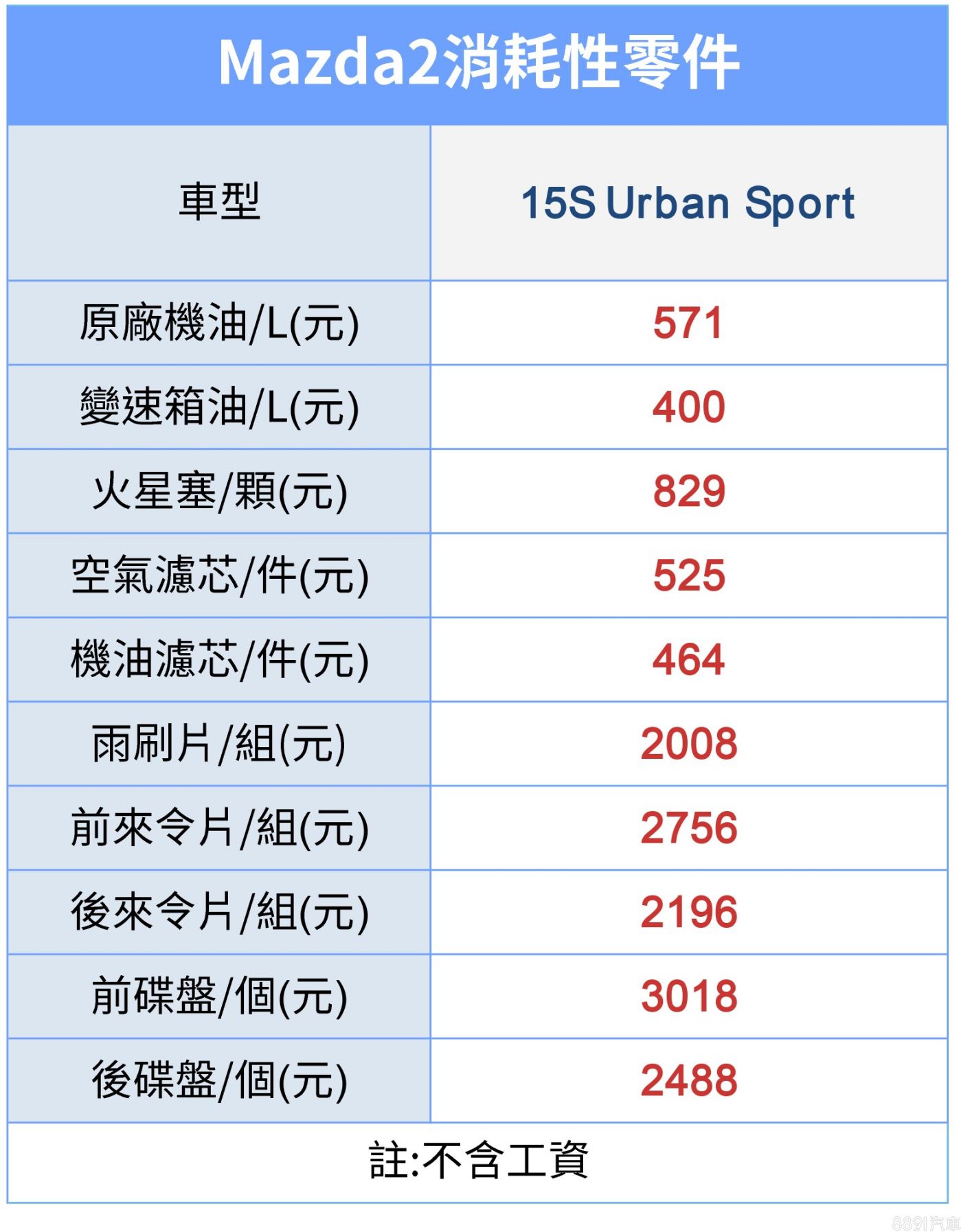 雖然是進口身份,但以Mazda2主打都會小車、通勤代步的身份來說,消耗性零件並沒有比國產車貴到哪去,開價大多都落在平價範圍,其中值得一提的是雨刷片一組要價2008元是比較高的,但這小東西可以輕鬆在外買到同規格的品項且自行DIY更換,不一定要在原廠施作。