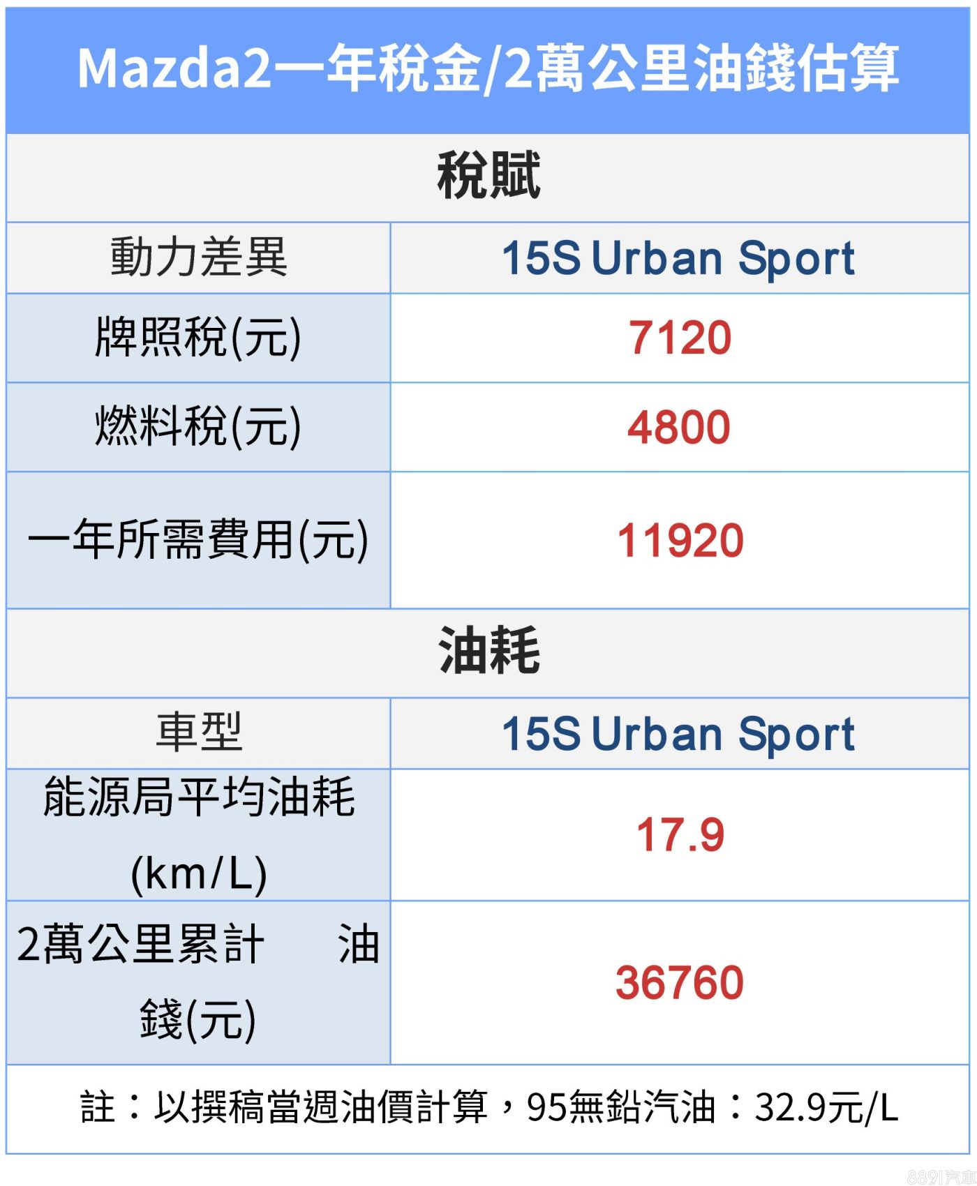 Mazda2採用1.5升四缸NA引擎,每年稅金僅萬元出頭,負擔不大,雖然搭載沒有太多高科技的傳統NA引擎,但繳出的17.9km/L平均油耗算是相當不錯的成績,累計2萬km油錢為36760元,經濟性表現符合這類入門小車的水準,小資族開起來也很省。
