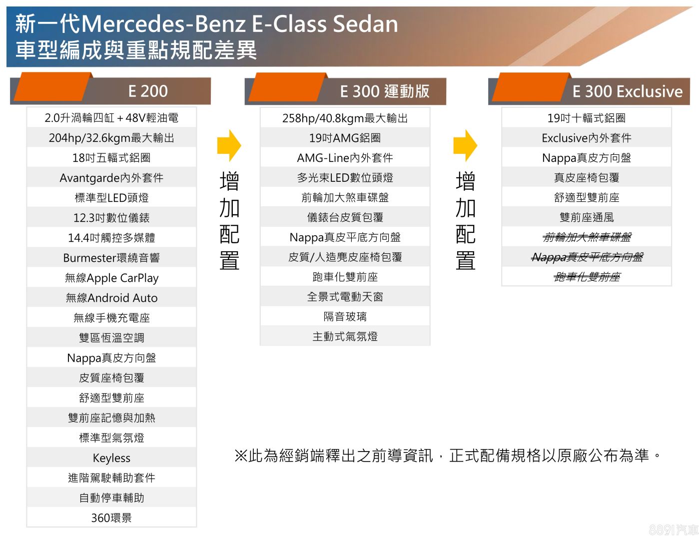 大改款賓士E-Class的台灣發表沒趕上原本推測的第三季,雖說尚無明確上市時程,但接單資訊倒是先行曝了光,首批販售編成包含一款E 200和兩款E 300,分別搭載輸出不同的2.0升輕油電渦輪四缸動力,價格資訊則待後續公布。
