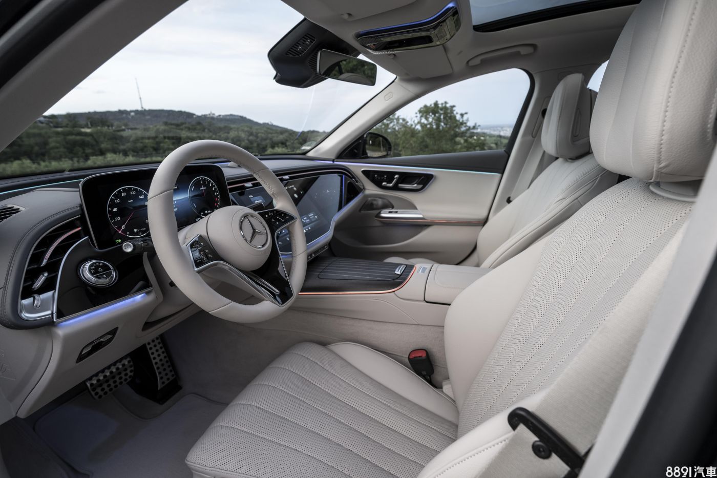 座椅規格視車型而異,E 200標配皮質標準座椅,雙前座均可記憶和加熱;中階款配合AMG-Line套件,是唯一標配跑車化雙前座和平底方向盤的車型,椅面採皮質/人造麂皮混拼包覆。頂規則換上真皮座椅,雙前座還新增通風功能。