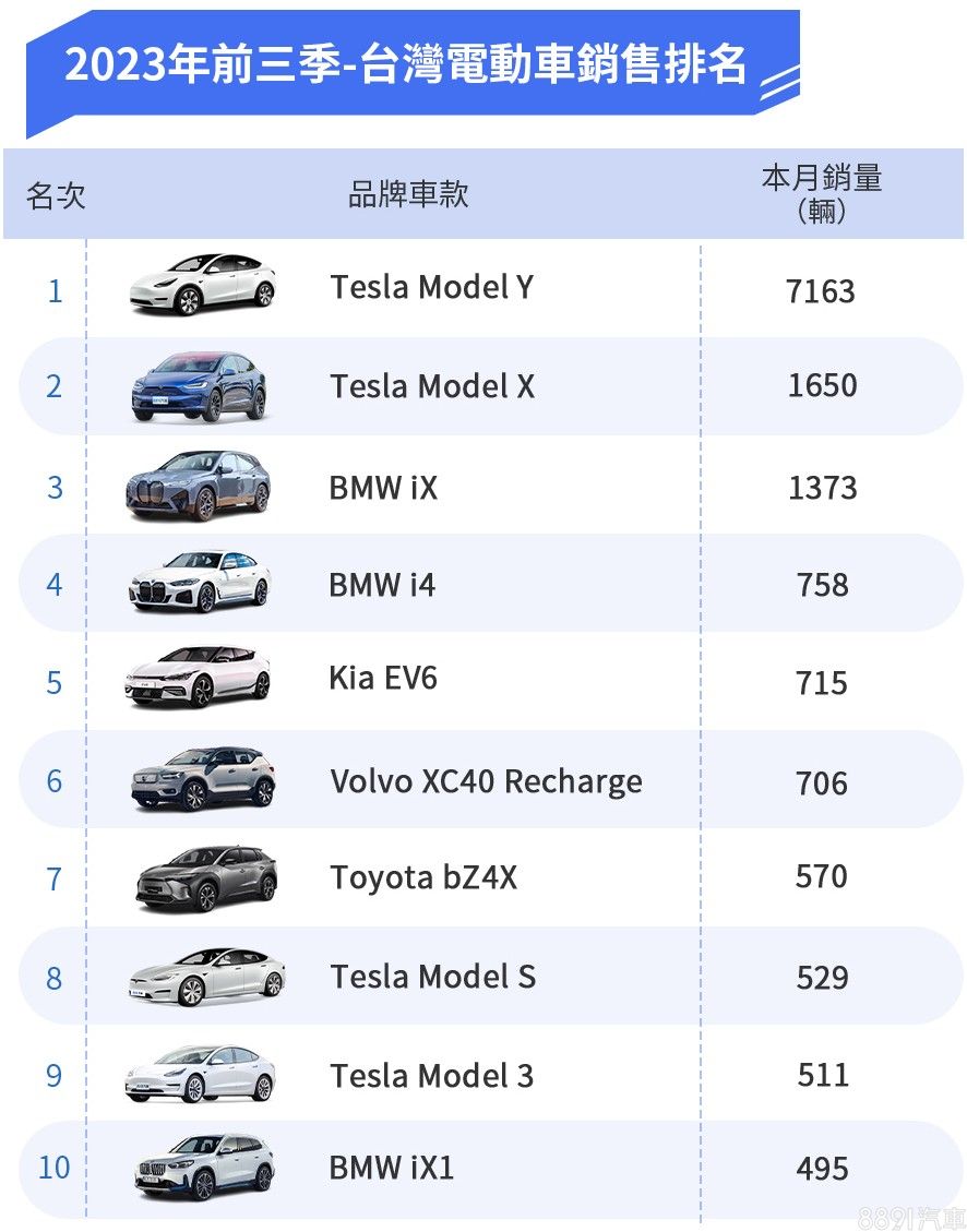 前三季表現最好的「不出意外」就是Tesla Model Y,累積掛牌數7163輛,海放眾家對手,甚至是2~10名全部加起來也才「險勝」它一點點,展現主宰級的銷售實力!而除了Model Y之外,品牌其他車款也全數上榜,有趣的是Model 3今年因為改款而暫時停售,但累積511輛的成績仍舊能站上第9名的位置。