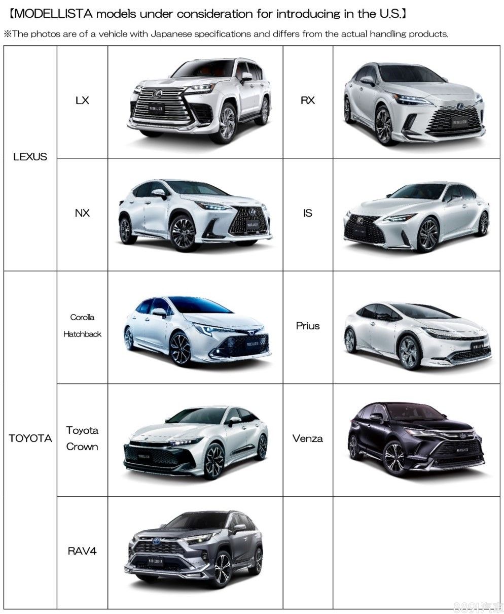 未來在美國市場,Modellista將篩選符合當地法規的改裝套件進行販售,在Lexus部分有IS、NX、RX、LX,Toyota部分則是Corolla、Prius、Crown Crossover、Venza、RAV4等,共計有9款車型有對應空力套件可選購。至於實際販售細節,將會在10/31~11/3進行公佈,有興趣可以關注SEMA Show官方訊息。