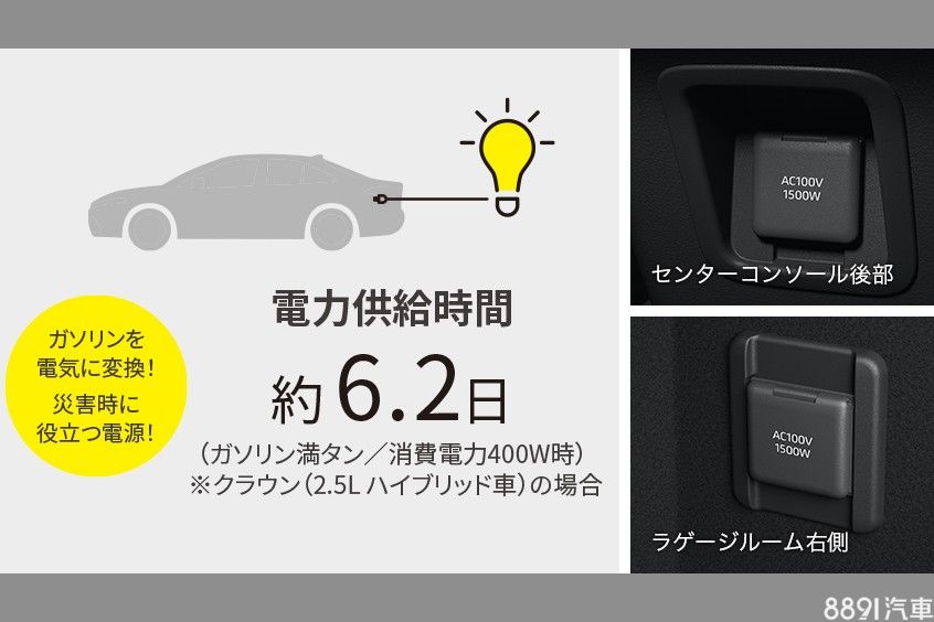 Crown Sport Hybrid搭載5Ah的鎳氫電池(NiMH),除了可用來驅動馬達外,亦可向外供電作為緊急電力使用。車內在前座中央扶手後方和行李廂右側都設置有AC 100V/1500W的插座,並在滿油滿電的狀況下,可提供約6.2日的用電量。