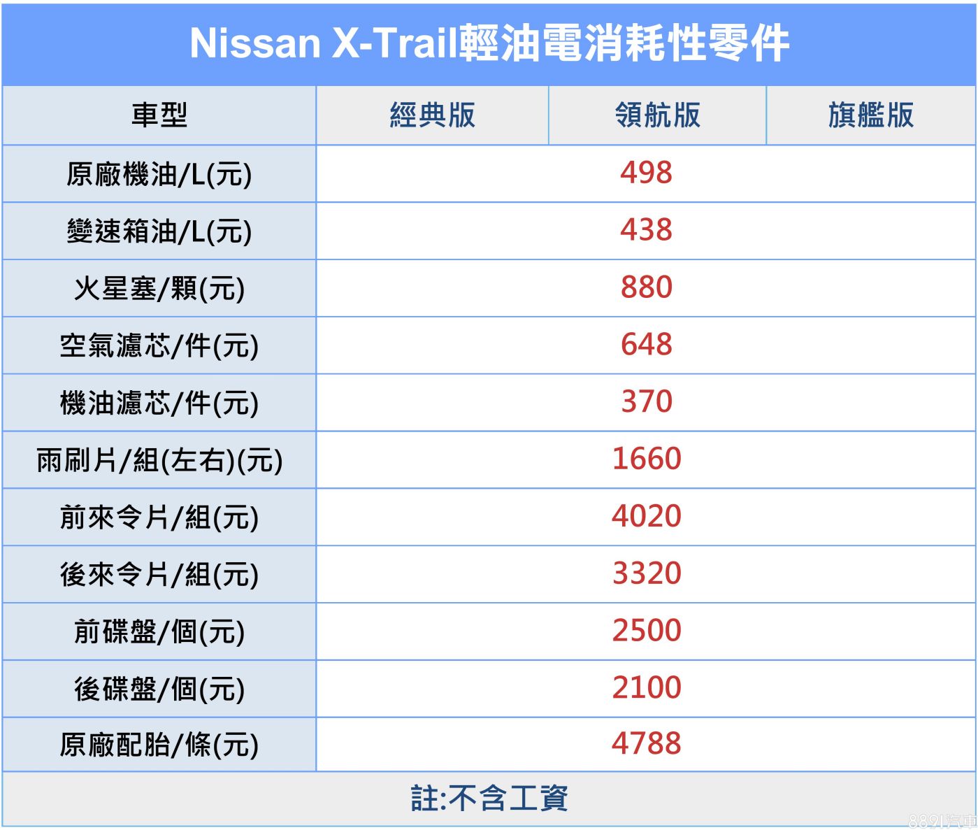 新世代X-Trail進口版e-Power的保養成本已算相對低廉,原廠定保方面已算是「進口車國產價」,而這次的國產版輕油電車型也維持過往設定,統一以四萬公里為保養循環,大保養最高也僅需5700元即可搞定,甚至初次保養費用還比進口版稍低一些,親民程度再上層樓!