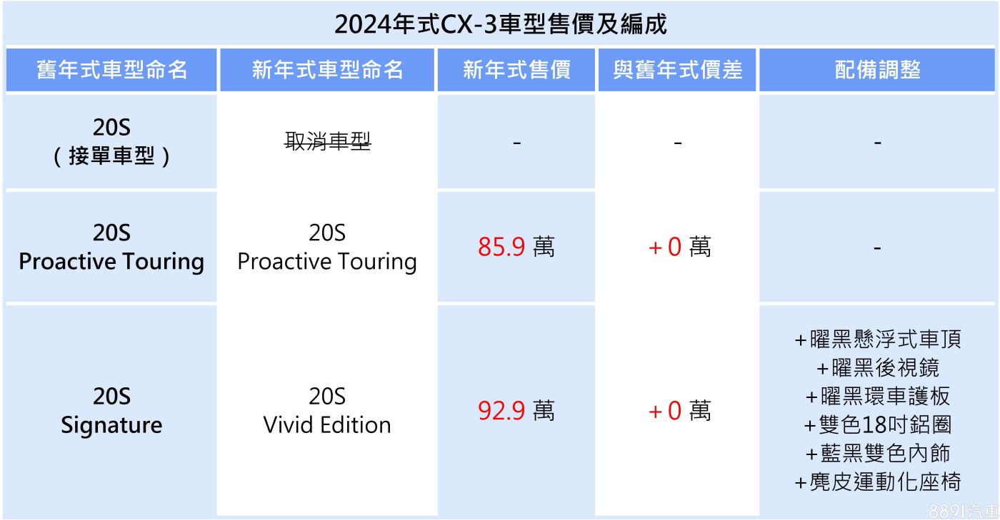 台灣馬自達今(10/19)正式發表2024年式CX-3,編成取消77.9萬的入門20S接單車型,中階及頂規車型售價則維持原有的85.9萬、92.9萬,另外也針對頂規車型導入多樣個性化內外觀套件,並將車型名稱改為20S Vivid Edition。