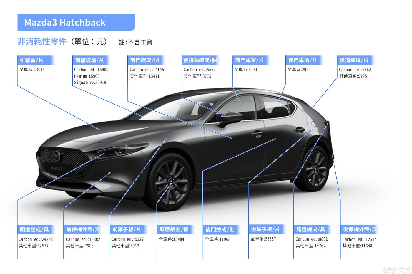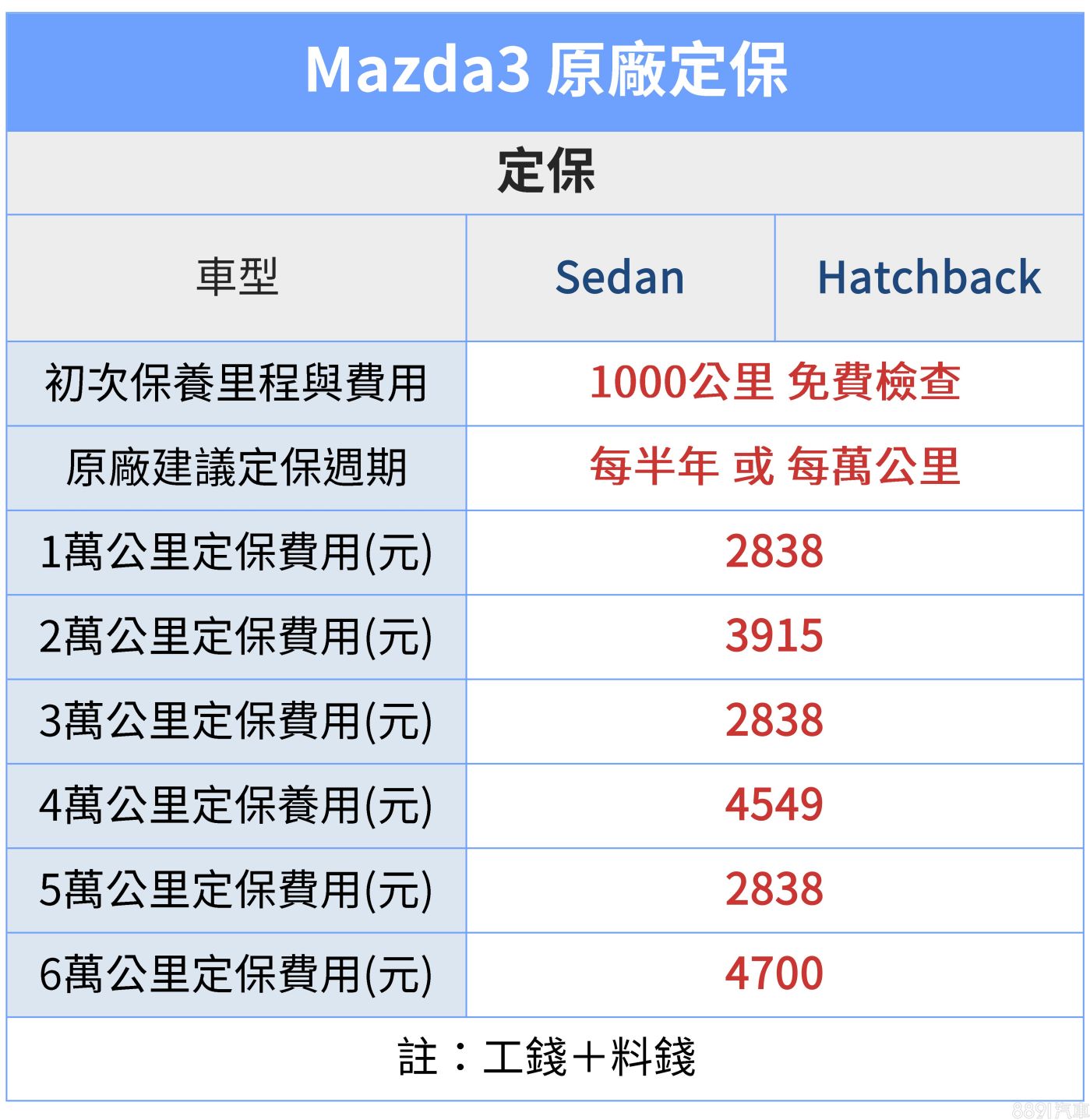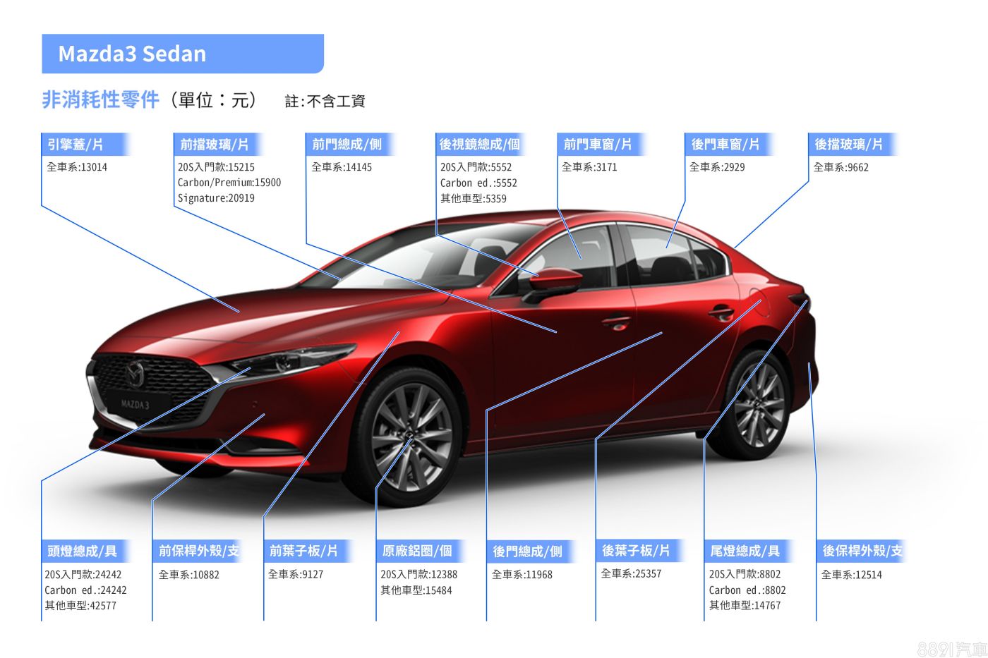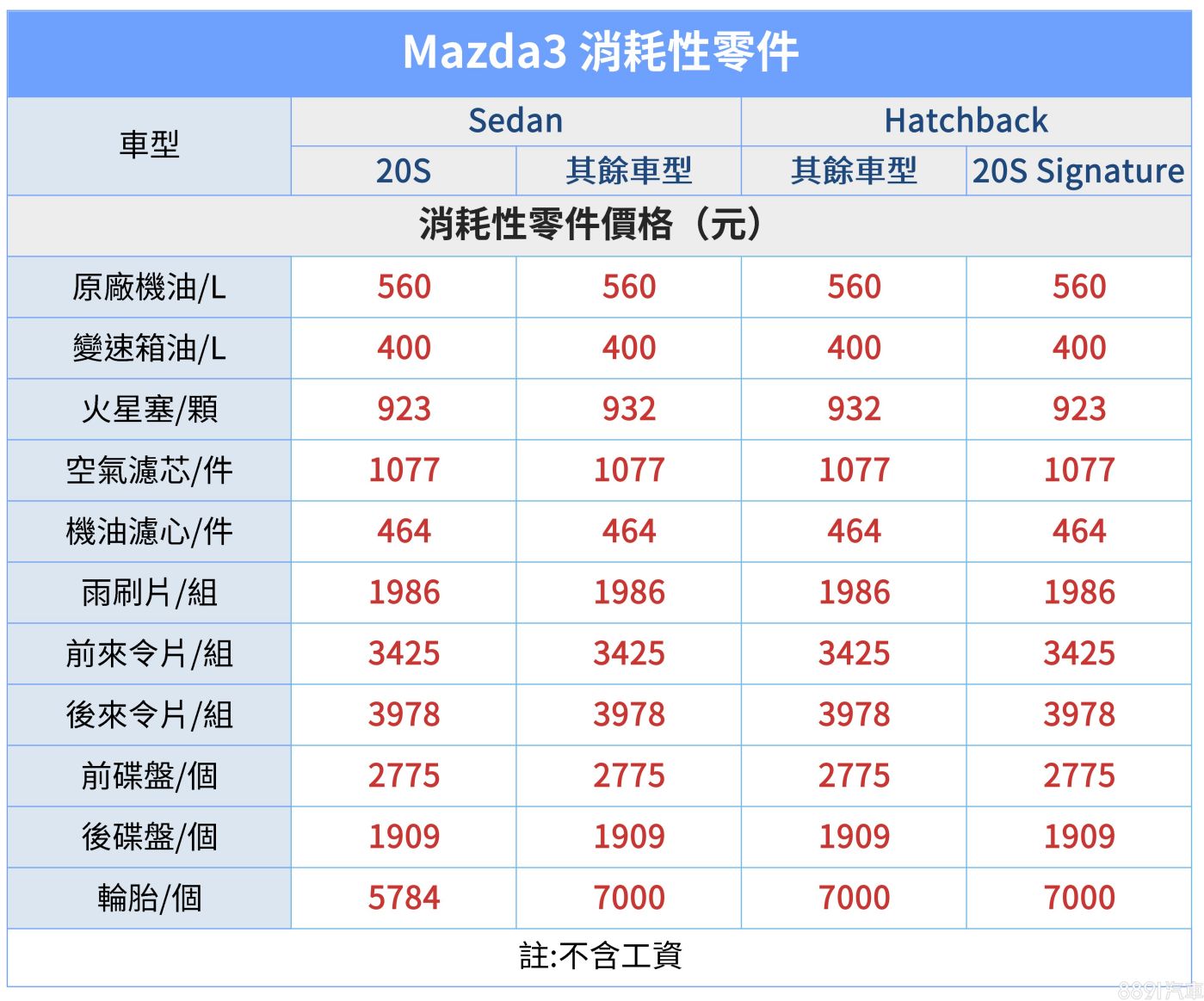 不只定保費用平價,Mazda3耗材料價也相當合理,並沒有因為進口身分而感到難以高攀,各車型間大多數消耗性零件價差甚微,唯車系入門款「四門20S」因搭16吋配胎,輪胎單價比起其餘車型的18吋規格低廉不少。