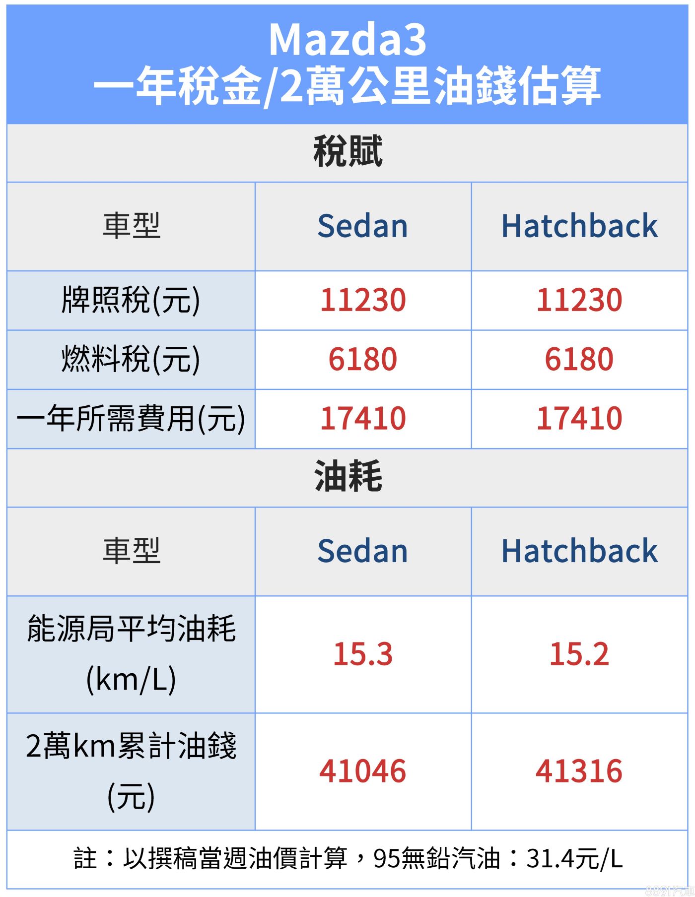國內Mazda3統一搭載2.0升NA動力,屬1.8~2.4稅金級距,年度牌燃費合計17410元,相較於國產同級排氣量多在1.8升內,得多繳5490元給政府。此外,由於平均油耗並非特別出色,若以每年行駛2萬km計,換算下來光油錢和稅金,每年就有將近6萬元的支出。