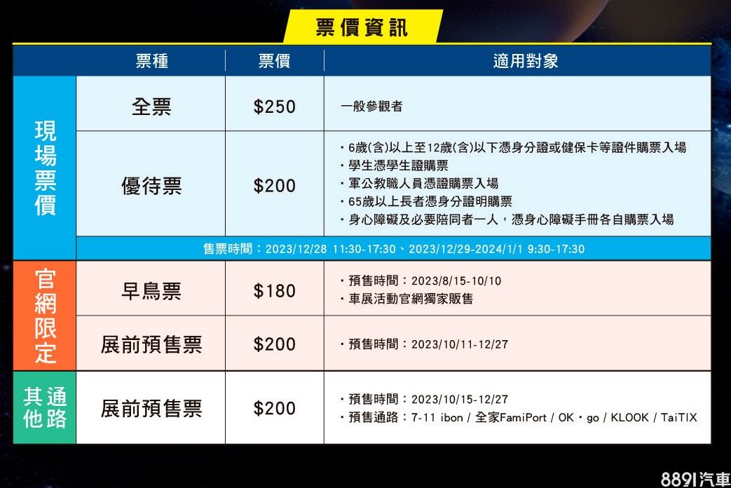 因應全球電氣化趨勢,2024台北車展除了諸多新車,也設置有充電樁設備服務專區,並提供新能源產業等相關資訊,目前除了官網售票通路,也可由超商與線上通路買票,即日起至統一超商、全家便利商店、OK便利商店等,均能享展前預售優惠200元的票價(原價250元),Klook與TaiTix同步開賣,優惠截止日期為12/27,6歲以下孩童能免費入場。
