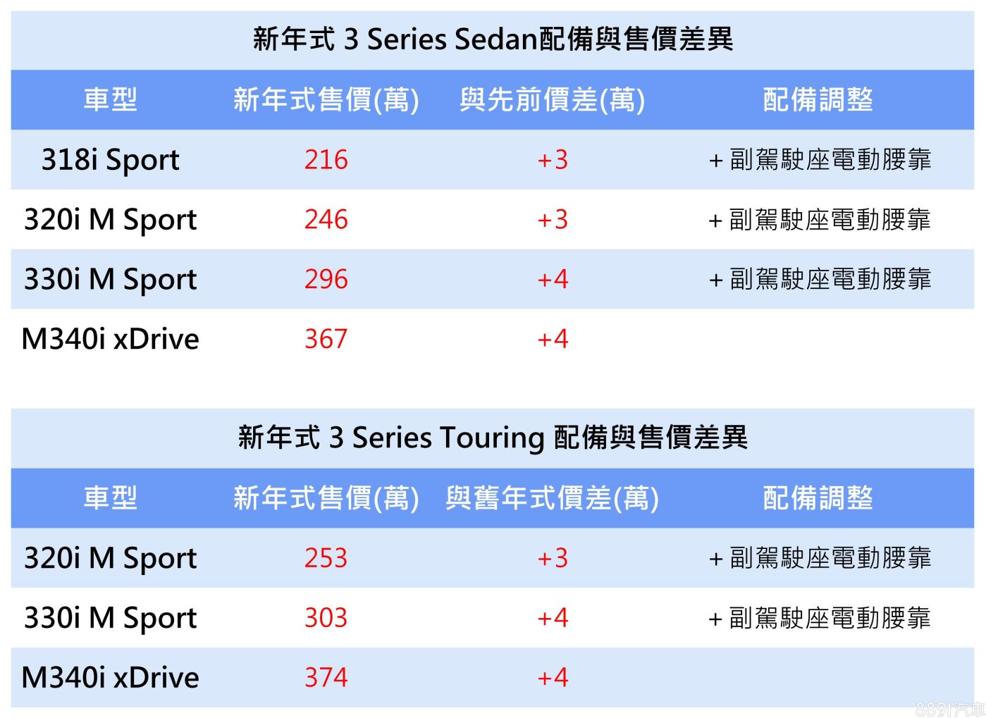 BMW旗下多款車系,稍早同步上架2024年式版本!當中,暢銷車系3系列,包含Sedan房車與Touring旅行車型,各車型調漲3~4萬不等,同時針對車系非M Performance車型,新增標配副駕駛座電動腰靠。
