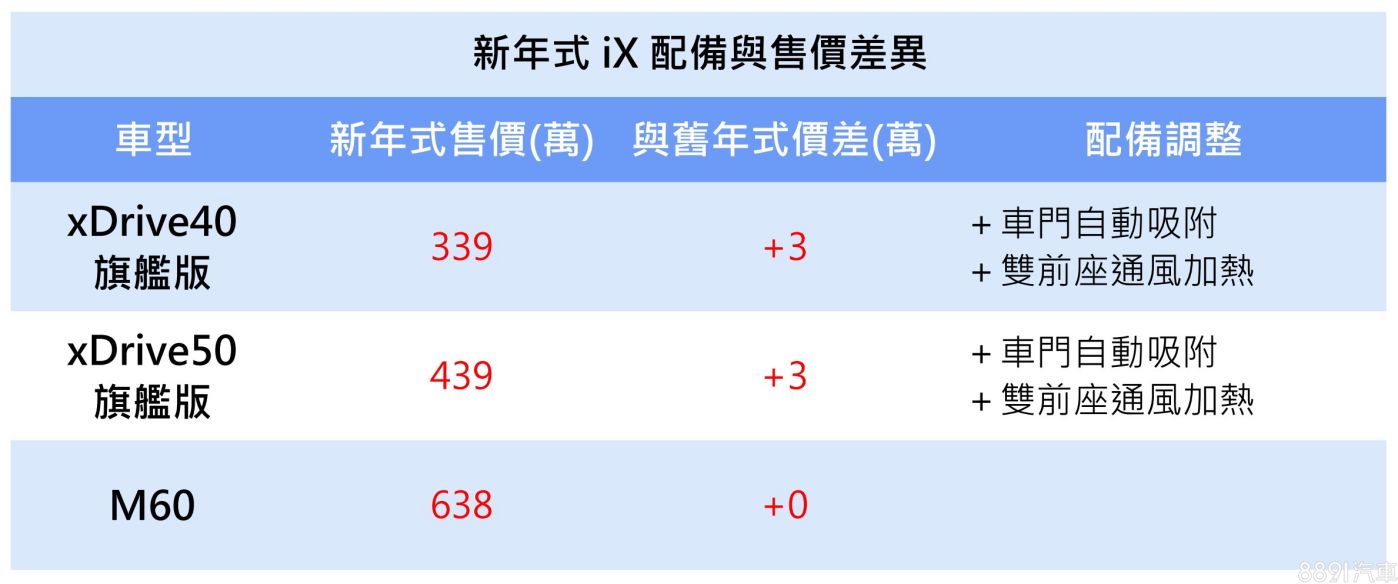 純電休旅iX,新年式針對較入門的xDrive40和xDrive50兩車型調漲3萬,但也一併升級標配車門自動吸附和通風、加熱雙前座等配備,至於頂規M60車型則維持原售價與規格。