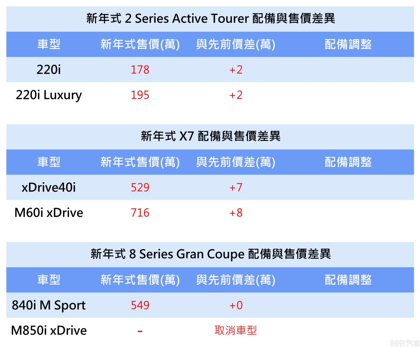 除上述車型外,2系列MPV全車系小漲2萬,X7則有7~8萬漲幅,兩車系均維持既有編成與配備規格。8系列Gran Coupe則自新年式起取消M850i xDrive,縮編為840i M Sport單一車型,維持549萬售價,配備不變。