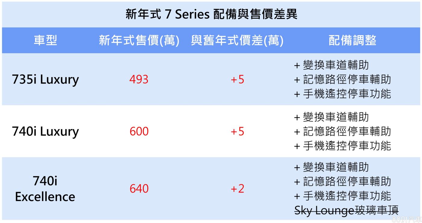 品牌旗艦房車7系列,先針對3款燃油版本發布新年式,全數新增車道變換輔助,自動停車系統則新增遙控停車和停車路徑記憶功能,因而為Luxury車型帶來5萬漲幅,較高階的740i Excellence則因同步取消Sky Lounge玻璃車頂,因而漲幅較少。