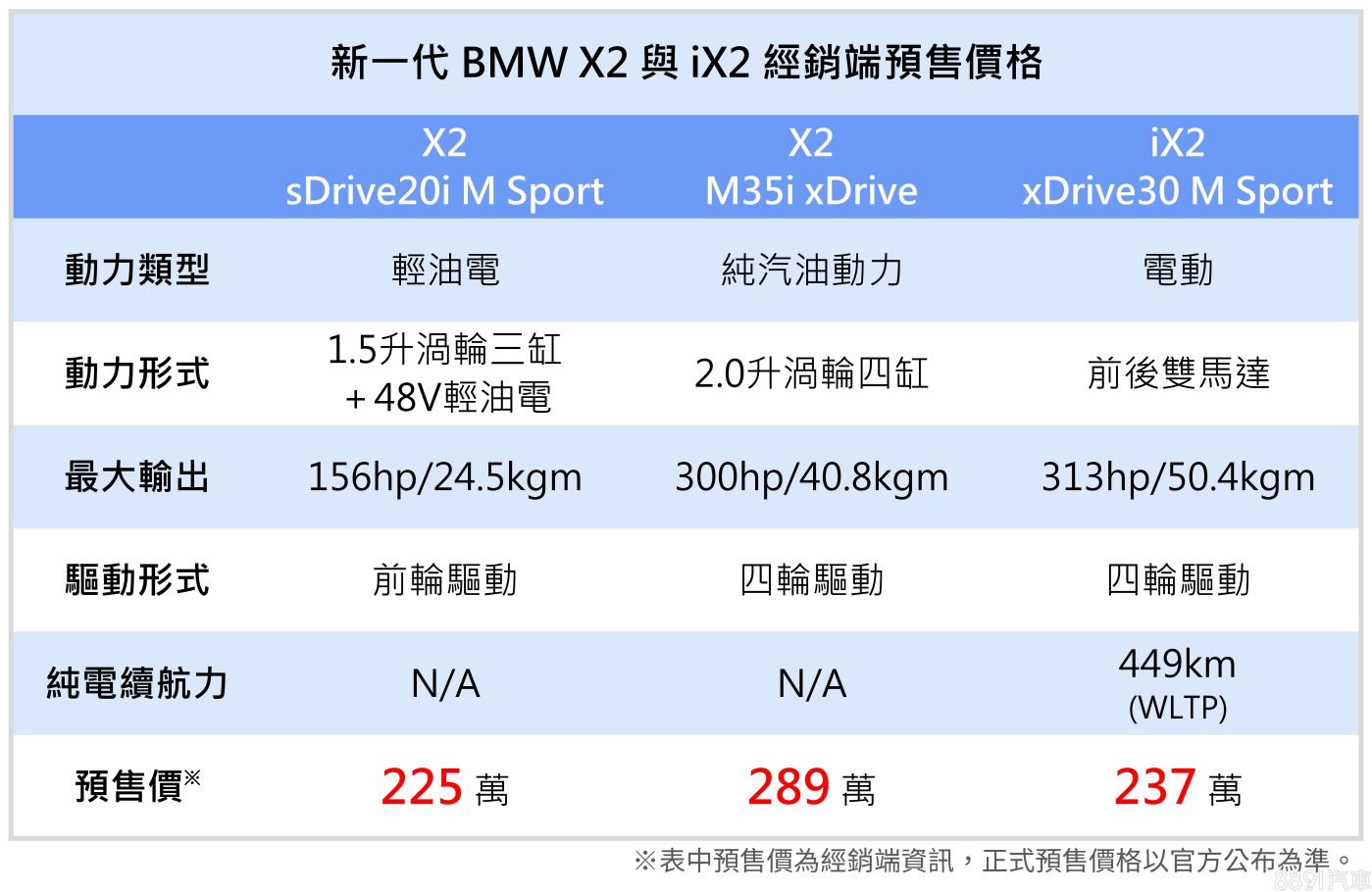 參考官網預購資訊,新一代X2將供應「sDrive20i M Sport」和「M35i xDrive」兩款汽油款,以及「iX2 xDrive30 M Sport」純電車型,而經銷端消息指出,三車型預售價將會落在225~289萬間。