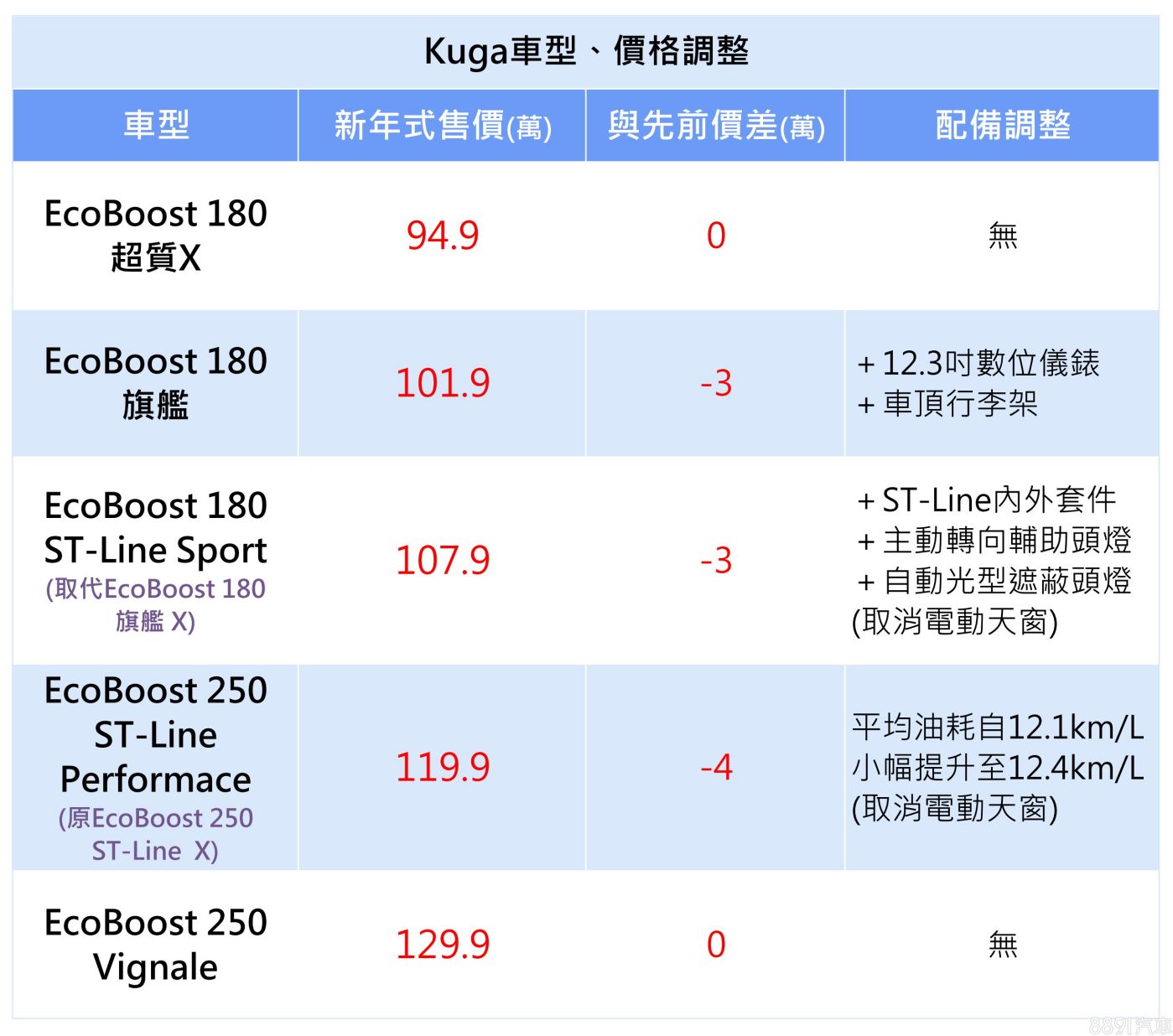 隨競爭激烈的國產中型SUV市場近期不斷推陳出新,Ford Kuga也宣布上架2024年式車型來應戰,車系維持五車型編成,價格帶仍為94.9~129.9萬,但除了入門款和頂規車型外,均配合年式更新調整標配並降價,降幅為3~4萬不等。