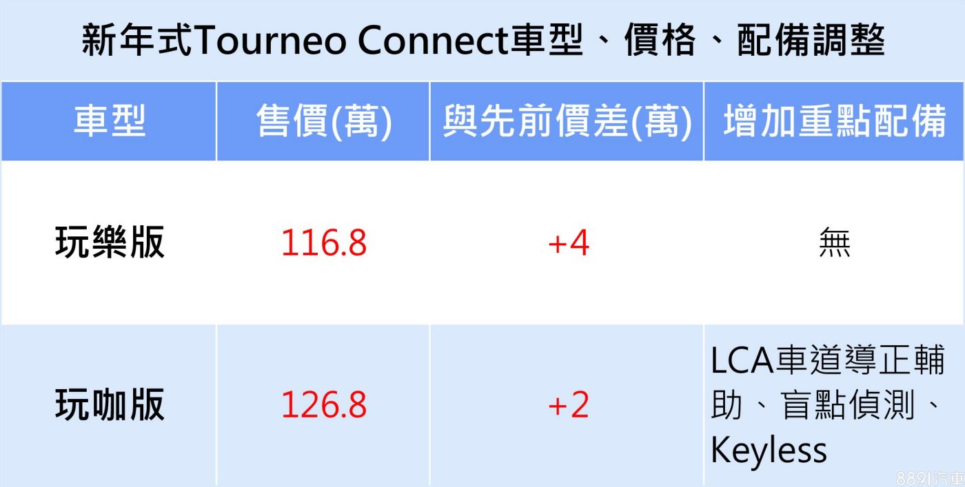 Ford新年式Tourneo Connect車系,維持玩樂版、玩咖版2車型編成,分別開出116.8、126.8萬元,較先前各有著4、2萬元之漲幅,漲價主要因素為因應全球環境動盪與原物料成本變化,而24年式新車預計於今年12月起進駐展間,並開始交付。