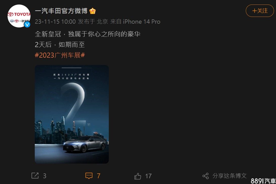 2023廣州車展即將於11/17開幕,由Toyota和第一汽車於中國合資成立的一汽豐田,稍早也預告了出展資訊,不過一看官方釋出的預覽圖,這不是月初才剛發表的Crown Sedan嗎?