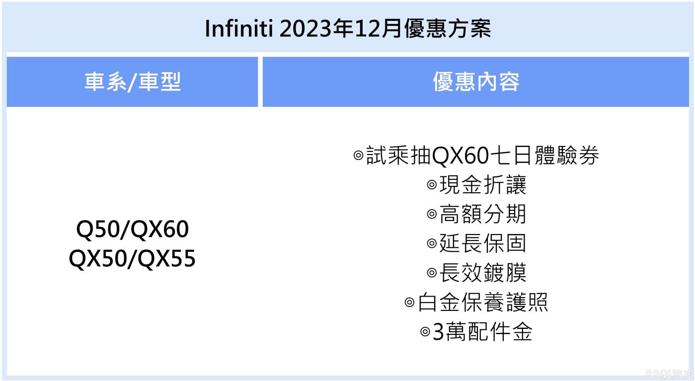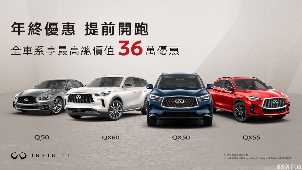 Infiniti本月全車系試乘可抽QX60七日體驗券,還能享有配件金、延長保固、現金折讓、高額分期等總值最高達36萬的購車優惠。