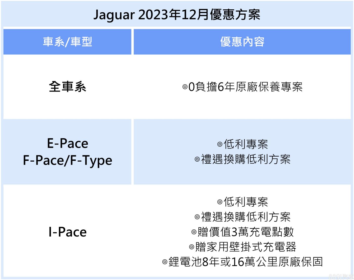 台灣捷豹路虎本月持續針對旗下全車系,推出0負擔6年原廠保養專案及購車低利率方案,I-Pace再享有電動車專屬禮遇。