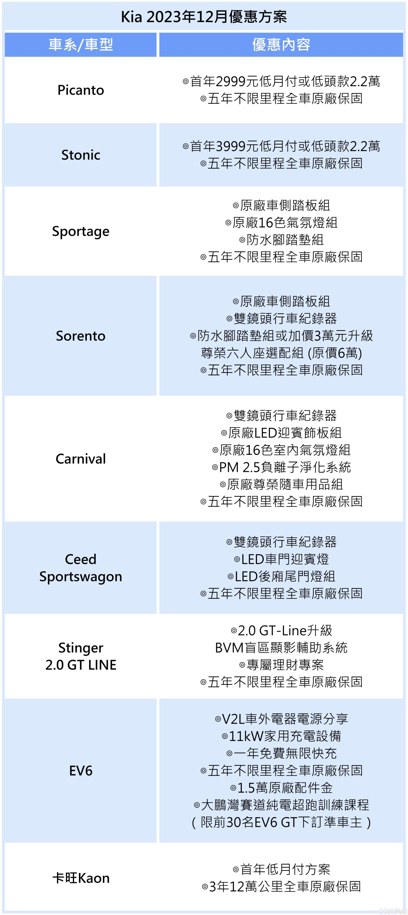 台灣森那美起亞本月持續針對眾多車系推出專屬優惠,部分乘用車款可享原廠保固、配件禮,商用車卡旺也有首年低月付方案全車原廠保固。