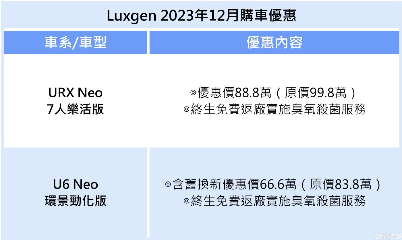 納智捷本月延續「∞無限專案」優惠活動,U6 Neo環景勁化版可享最高17.2萬現金折扣(含舊換新補助),此外全車系也持續享有終生回廠臭氧殺菌服務。
