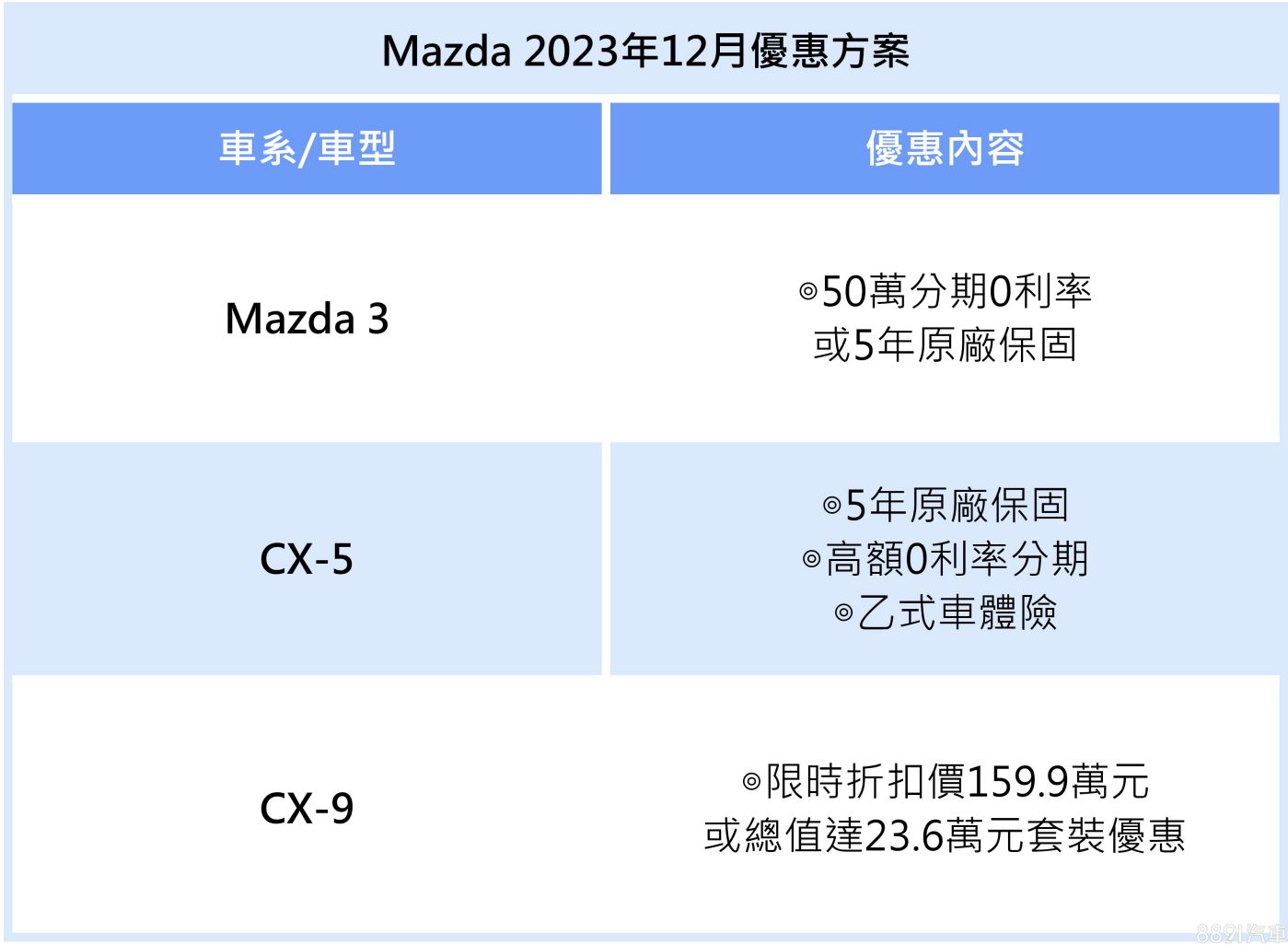 台灣馬自達本月針對Mazda 3、CX-5、CX-9車系推出專屬購車方案,可享高額0利率、5年原廠保固及乙式車體險等優惠,CX-9指定車型則打出高達23.6萬元的優惠折扣。