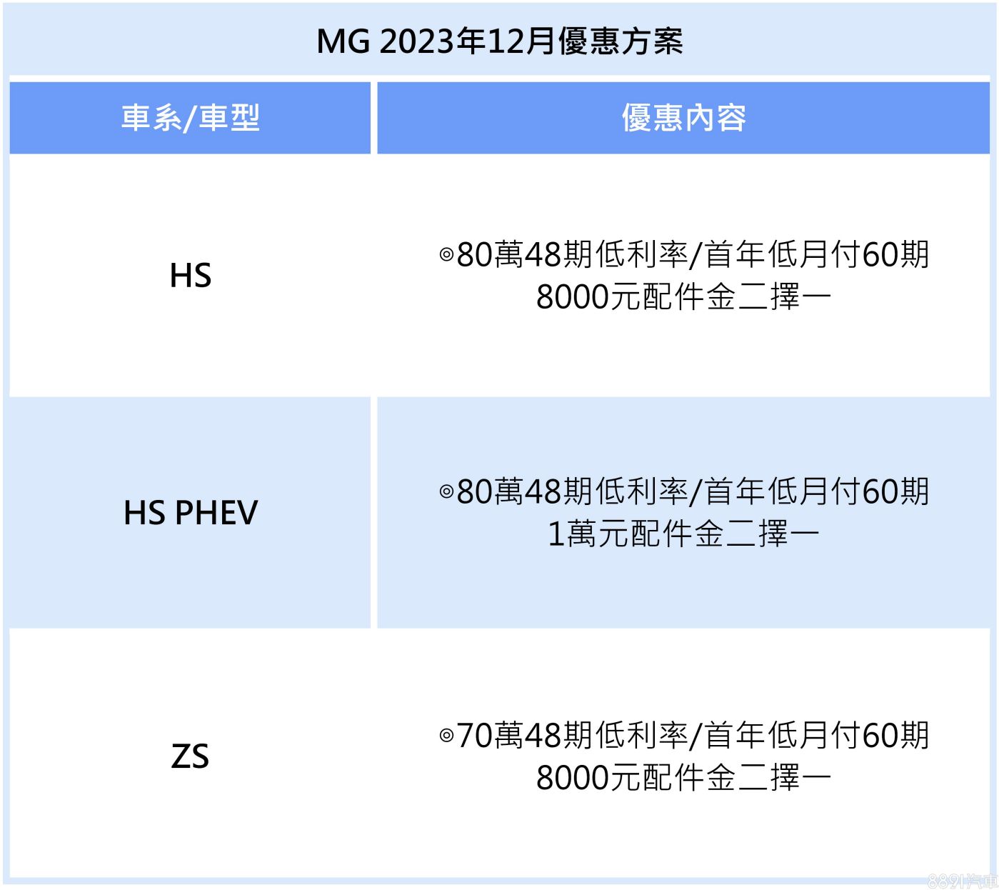 MG本月持續針對HS祭出輕鬆入主方案,購車即可享8000~1萬元原廠配件金或優惠貸款方案二選一,ZS也有原廠配件金8000元及優惠貸款方案可選。