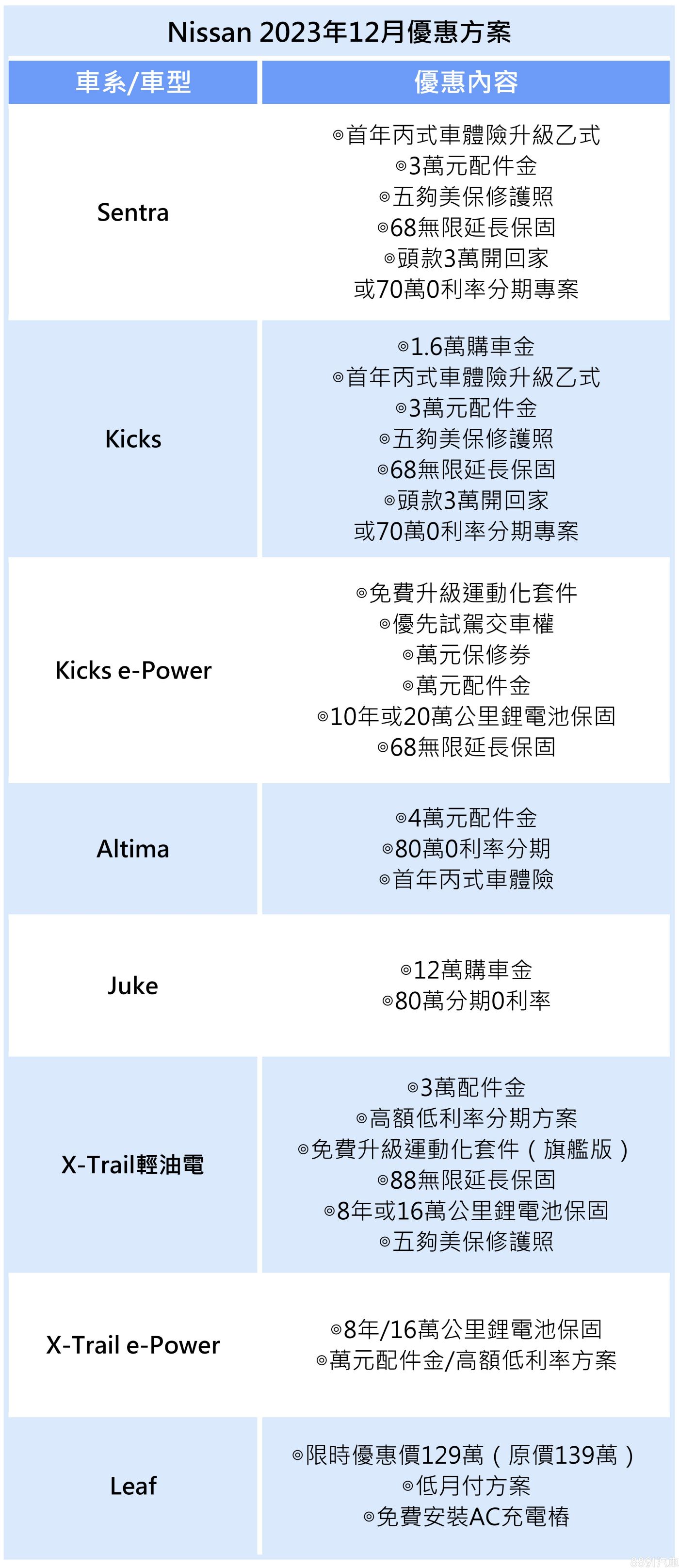 裕隆日產本月為歡慶品牌90週年,推出「家值美滿」購車專案,購買Kicks及Sentra可享5大套裝優惠,Kicks再加碼1.6萬購車金,進口車Juke及Leaf也有最高12萬元的折扣優惠。