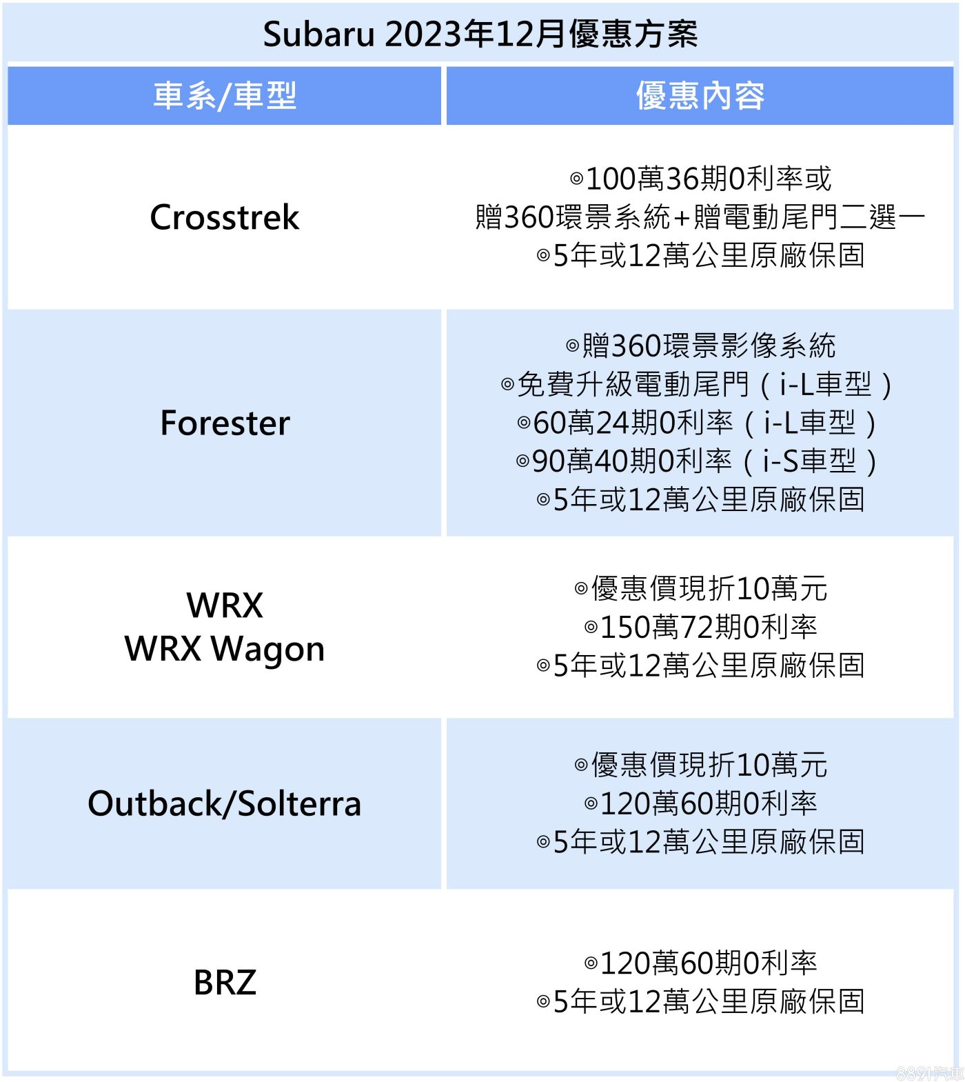速霸陸本月持續針對Outback、WRX、Solterra車系祭出現折10萬優惠價,另外還有高額分期、原廠保固方案,Crosstrek、Forester指定車型再贈360環景、電動尾門等配備。