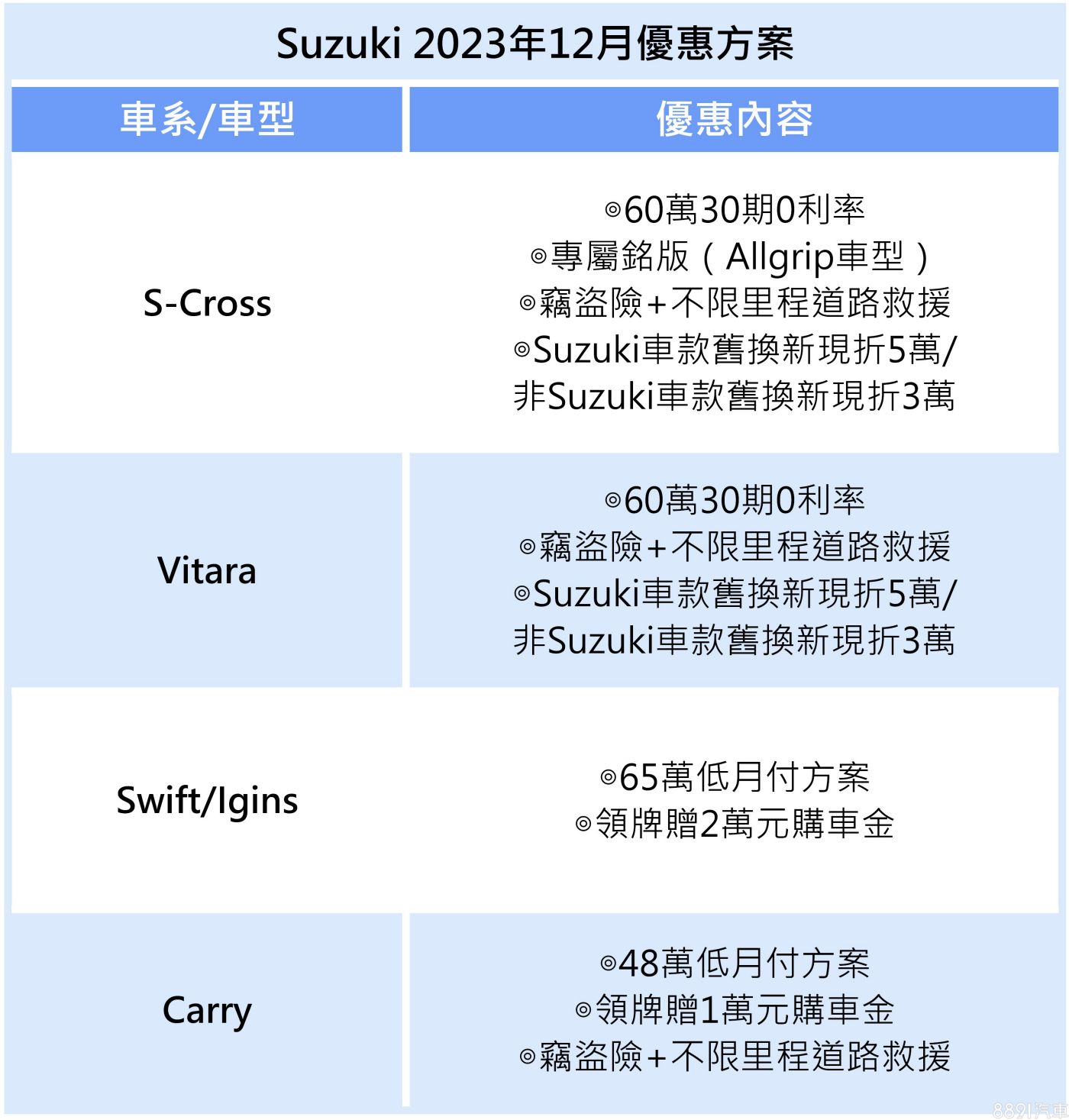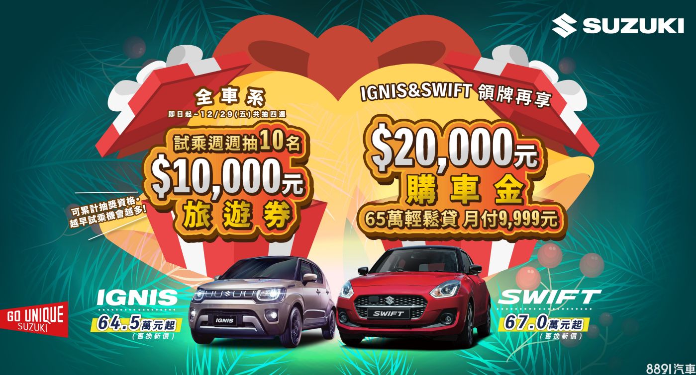 金鈴汽車本月全車系試乘可抽1萬元旅遊券,各車系也有專屬購車優惠,Swift、Igins、Carry有萬元購車金,Vitara、S-Cross可享最高60萬30期0利率,還有3~5萬舊車換新優惠折扣。