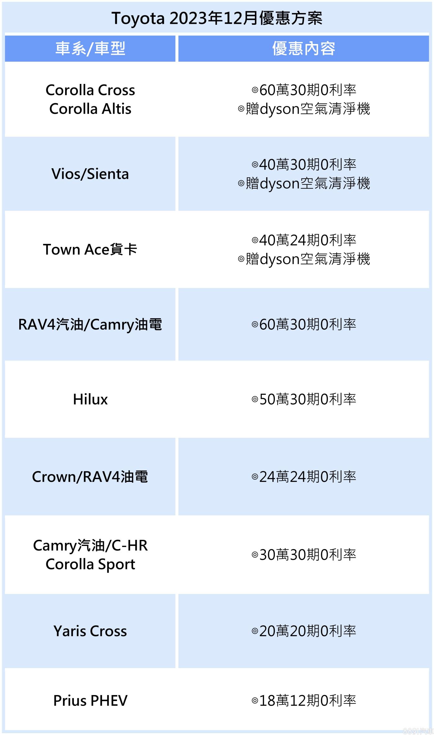 和泰豐田汽車本月入主Corolla Cross、Altis、Sienta、Vios、Town Ace貨卡即送dyson空氣清淨機,全車系最高可享60萬30期0利率優惠,Yaris Cross亦有20萬20期0利率分期方案。