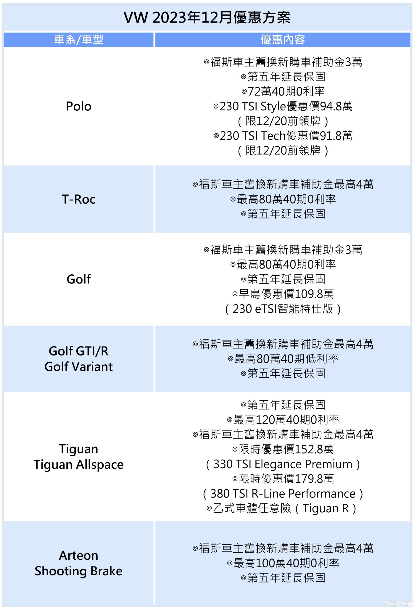 台灣福斯汽車本月持續針對Polo、Golf、Tiguan車系祭出最高15萬現金優惠,此外全車系也推出專屬購車優惠,除提供高額0利率、免費第5年延長保固等優惠外,福斯舊車主還可享有購車補助金。