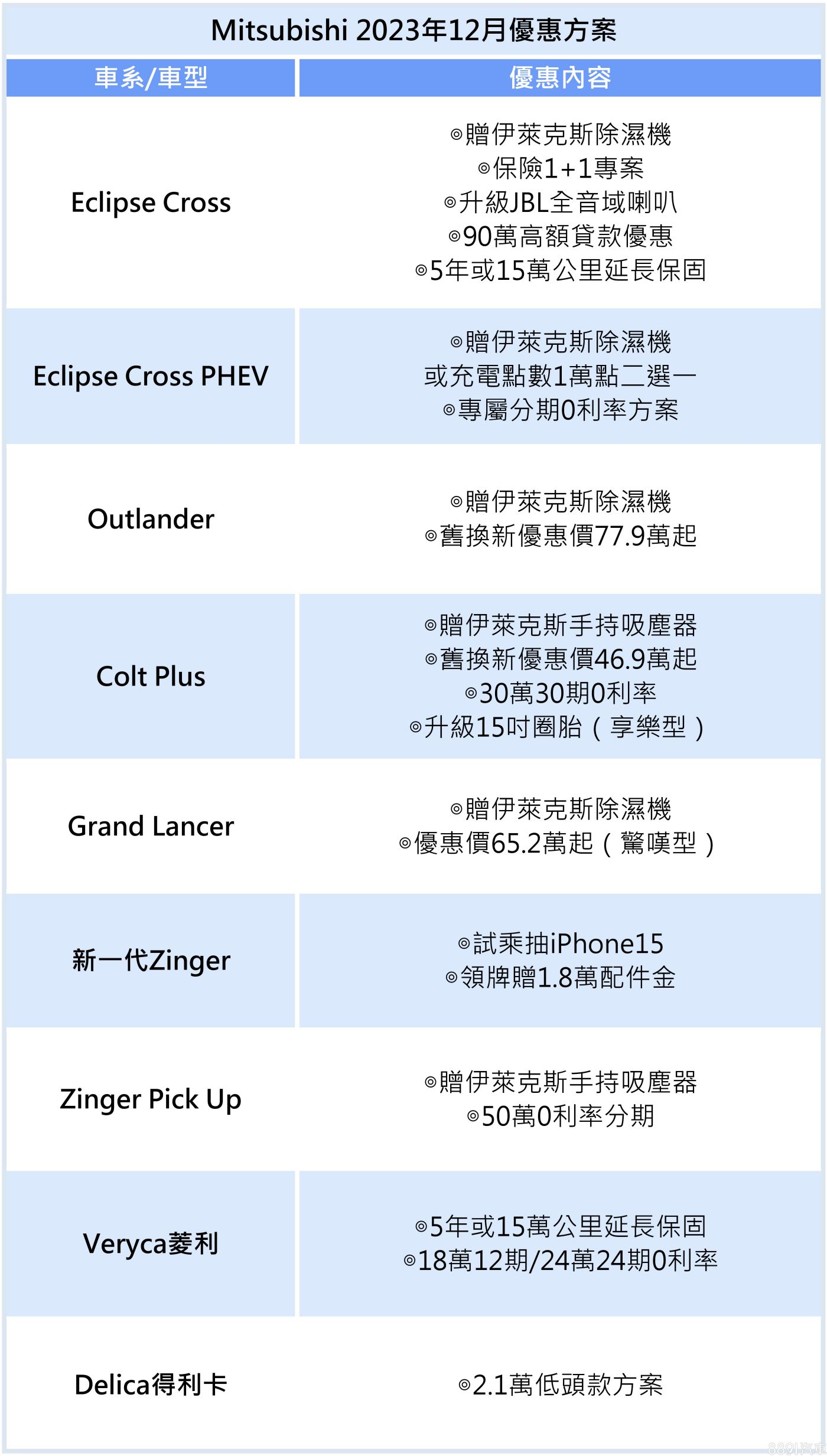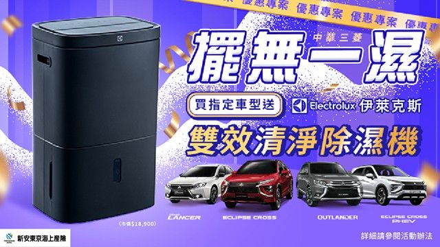 中華三菱本月延續「擺無一濕」購車活動,入主指定車系就送伊萊克斯除濕機或手持吸塵器,其餘多車系也有舊換新優惠價、延長保固或0利率分期專案,新一代Zinger試乘可抽iPhone15外,領牌再送1.8萬配件金。