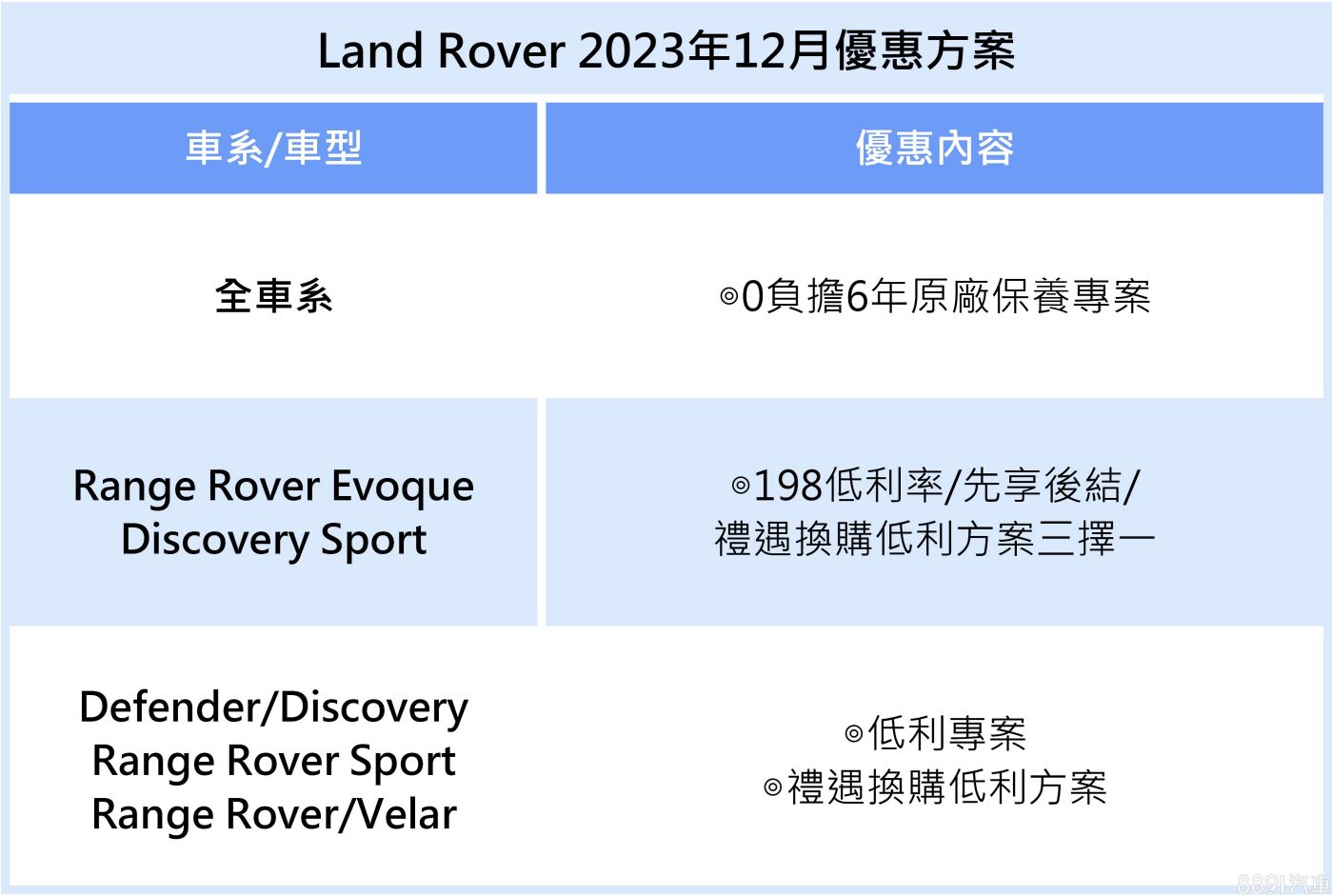 台灣捷豹路虎本月持續針對旗下全車系,推出0負擔6年原廠保養專案,指定車型再享購車低利率或換購方案。