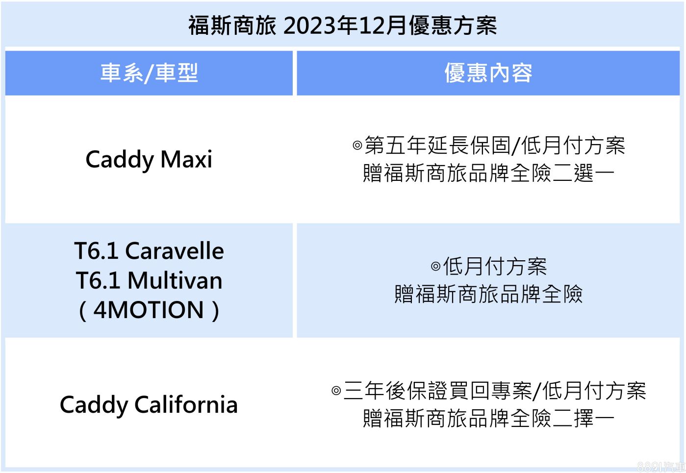 台灣福斯商旅本月持續針對旗下多車系,提供低月付方案贈福斯商旅品牌全險,指定車型還有第五年延長保固、三年後保證買回優惠專案可選。